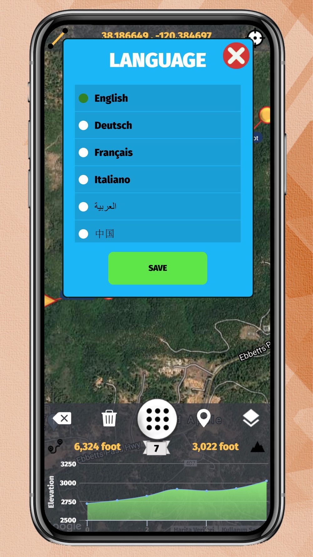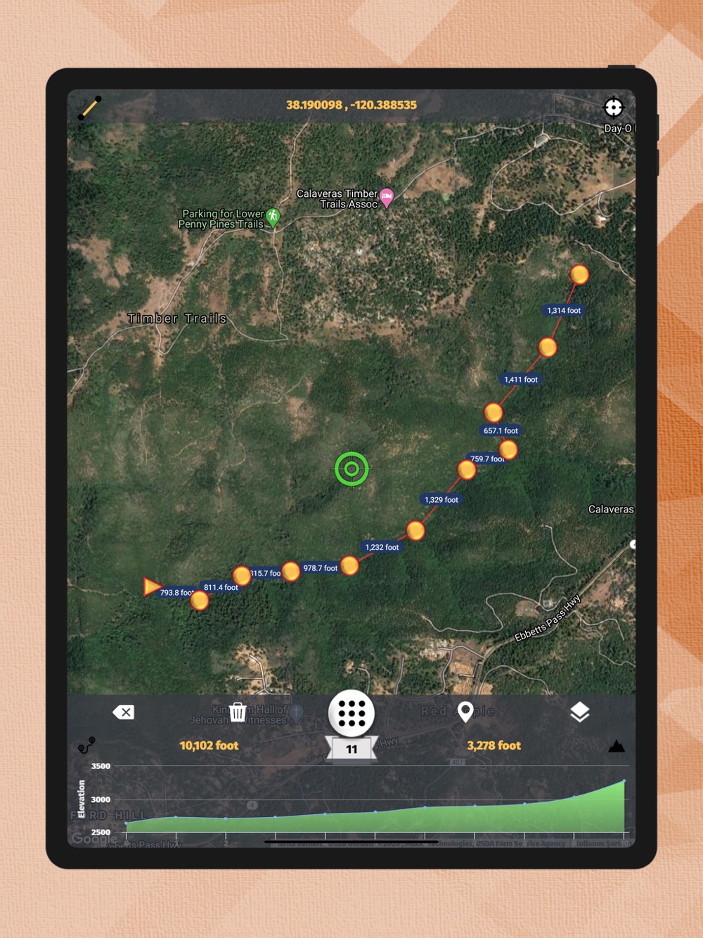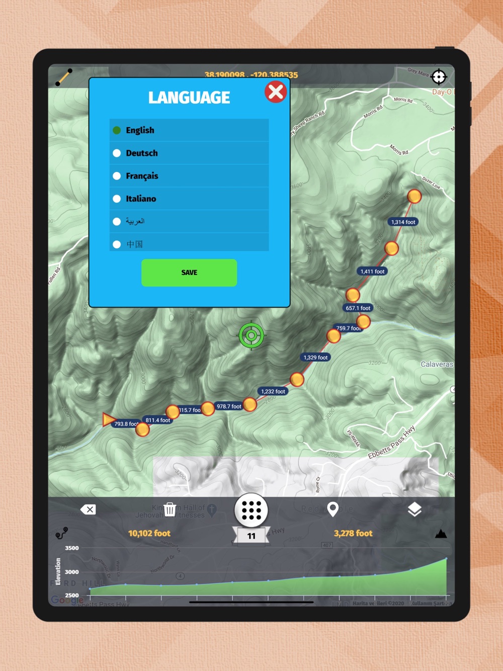 The application displays all elevation/altitude on the route determined instantly with high precision graphically. It also gives the slope, distance and height changes at each point. The distance and angle of the current point from the starting point are given.