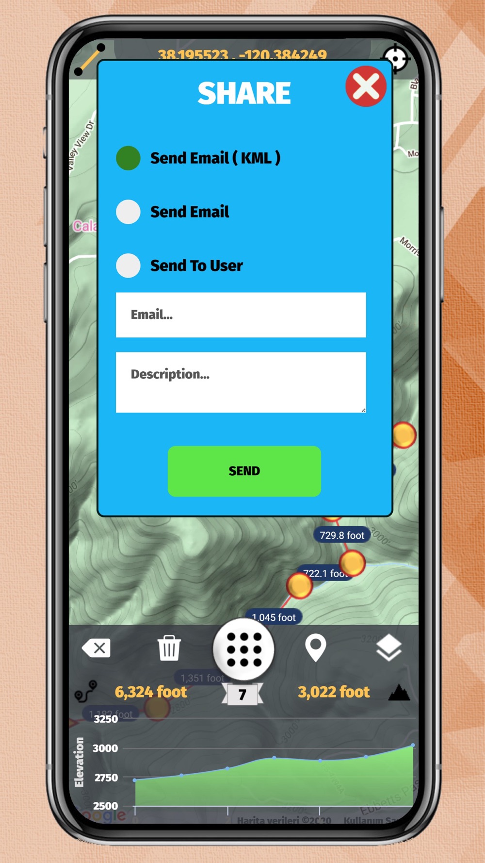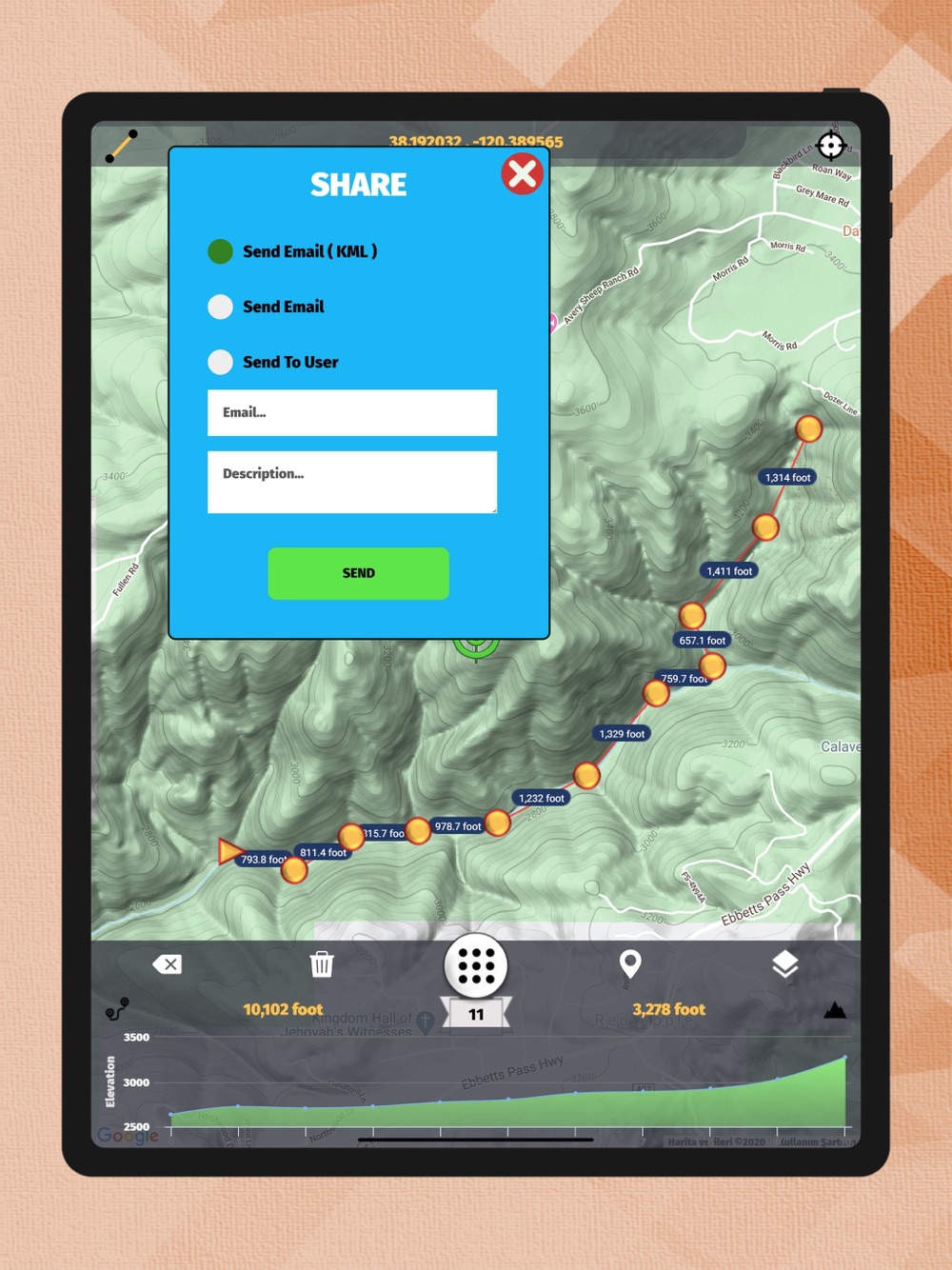 Unlimited route is created and saved through the application. If requested, the created route is shared as E-Mail and KML.
