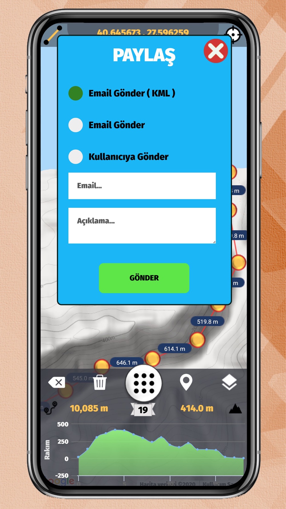 Uygulama üzerinden sınırsız olarak rota oluşturulup kaydedilir. İstenmesi durumunda oluşturulan rota E-Mail ve KML olarak paylaşılır.