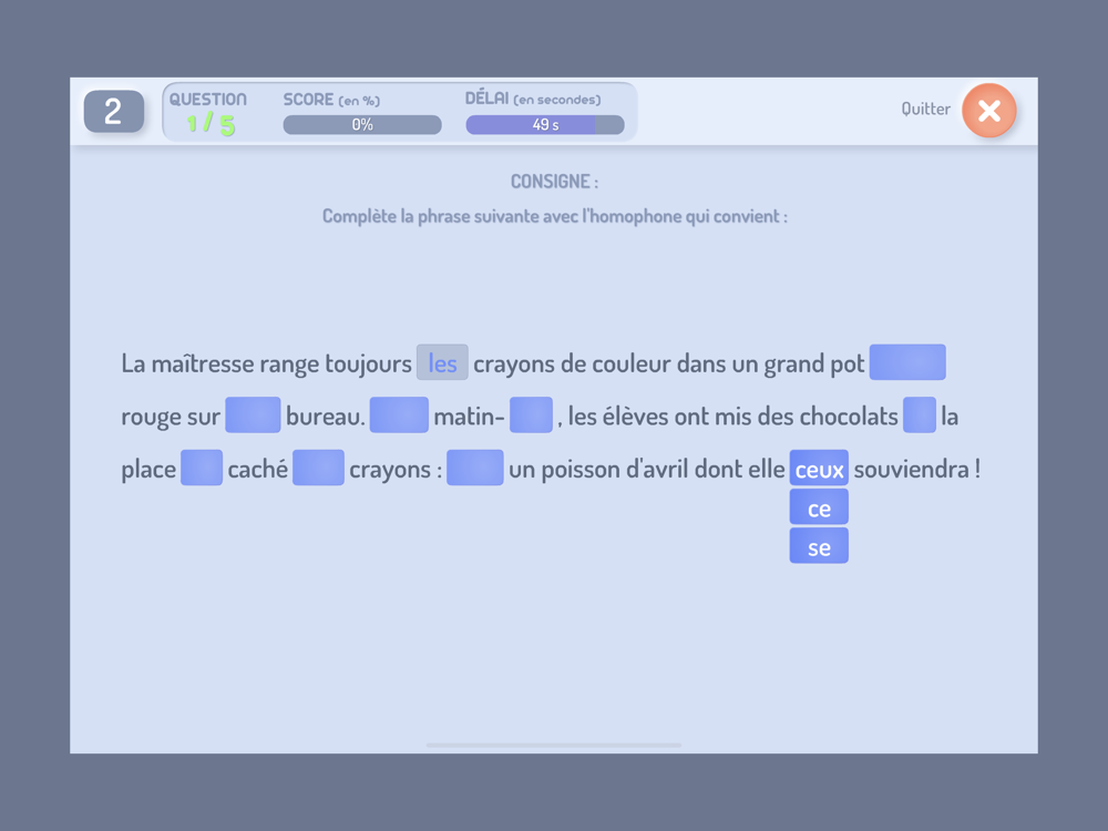 - Un exercice qui permet de travailler spécifiquement un ou plusieurs homophones. (un seul mot à trouver dans une phrase)