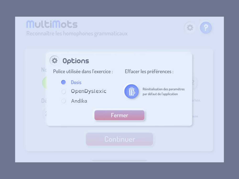 - La police d'affichage des phrases des exercices (Dosis, Open Dyslexic ou Andika)
