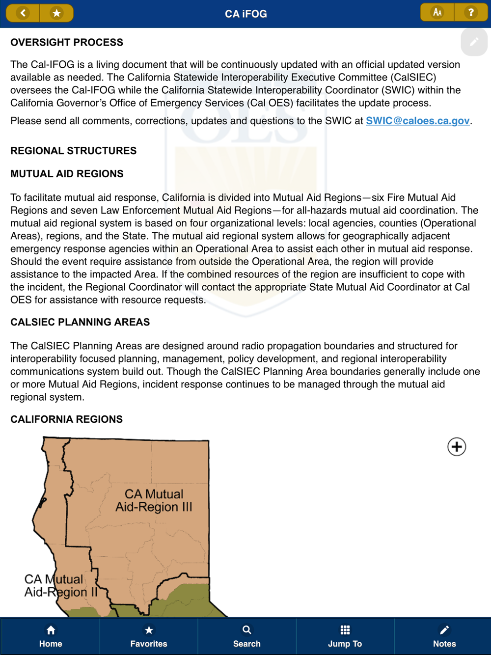 The CA iFOG mobile app gives users easy access to public safety communications information, offering a content index with links for quick jumps to reference sections, tables, figures, or images. The ability to save Favorites and create in-line notes enables personalized access to critical information. CA iFOG can be downloaded and then taken to the field as an offline reference, to be used without the need of an Internet connection.