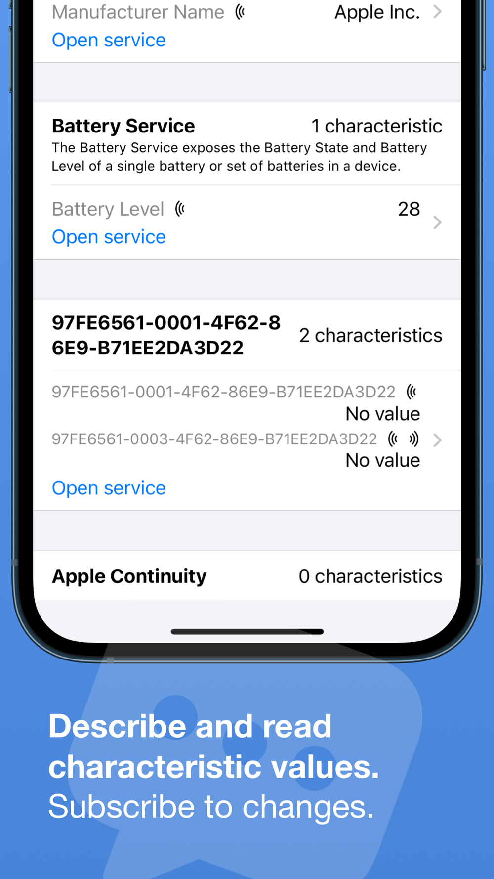 • Read any characteristic's value, even for services not well known and are custom to the device being interrogated.