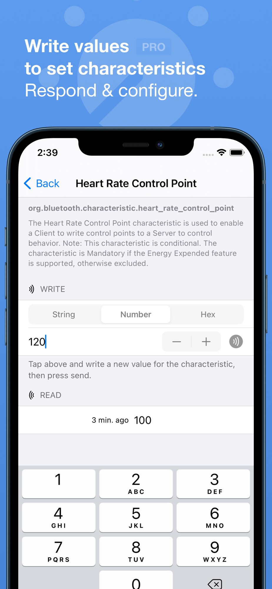 • Write characteristic values back to the peripheral as string, numeric or hex (pro).