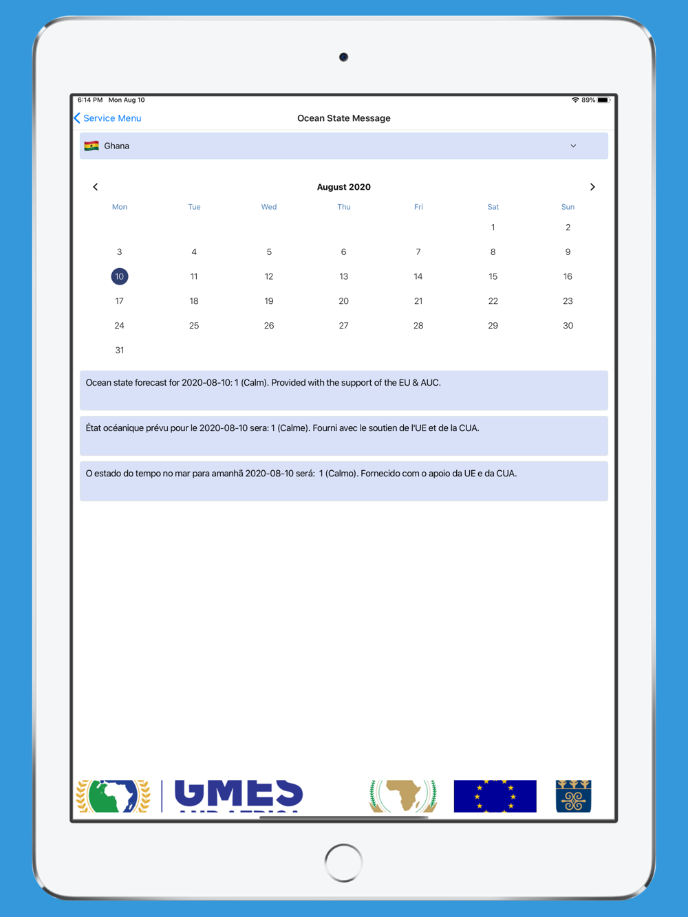 GMES-UG is a mobile application for disseminating coastal and marine state information, time series analysis, and Potential Fishing Zones (PFZs) information where applicable. The main aim of the application is to provide a reliable and consistent channel for the general public to receive information on the state of the coastal and marine areas and potential fishing zones for appropriate entities and individuals approved by GMES & Africa in the West African sub-region.