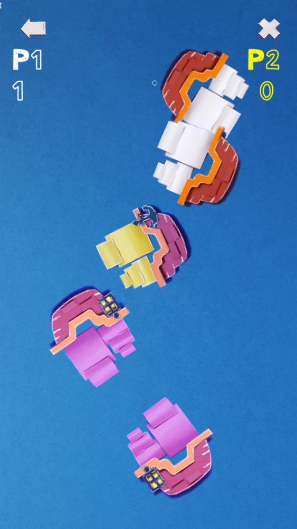 Tap on the ship to fire a star at other player's ship. Each player has a fleet of ships, direct them with your fingers to avoid other players projectiles or to aim. First player that reaches 10 points wins.