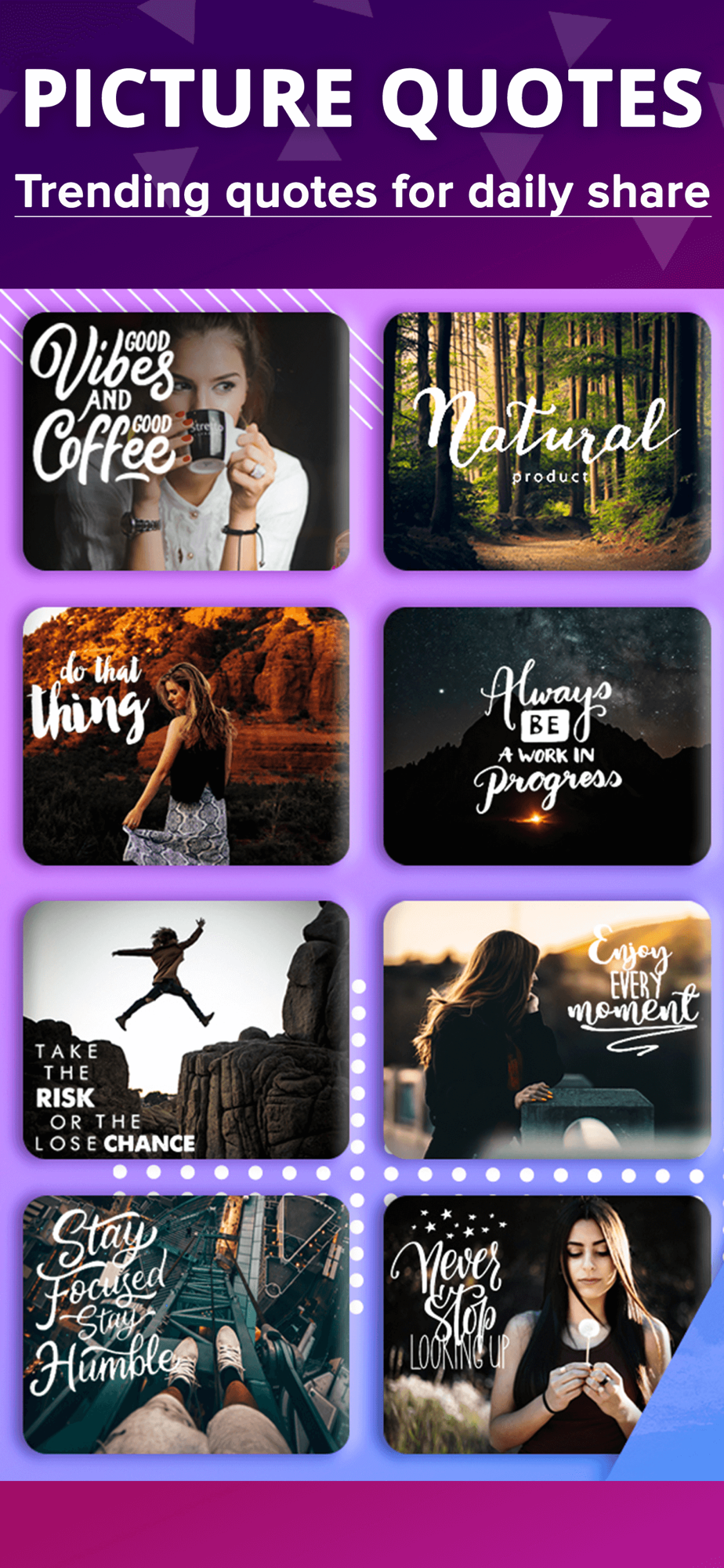 - 1000+ Backgrounds with 10+ categories like Sports, Good Morning, Good Night, Sad, Music, Breakup, Mother, Father, Valentine Day, Holi, Janmashtami, Independence day, New Year, Christmas, Navratri, Republic Day, Nature, Love, Baby, Winter, Art, Flowers, Animals etc… So, you can put inspiring quotes on your own background on picture quotes and creator.
