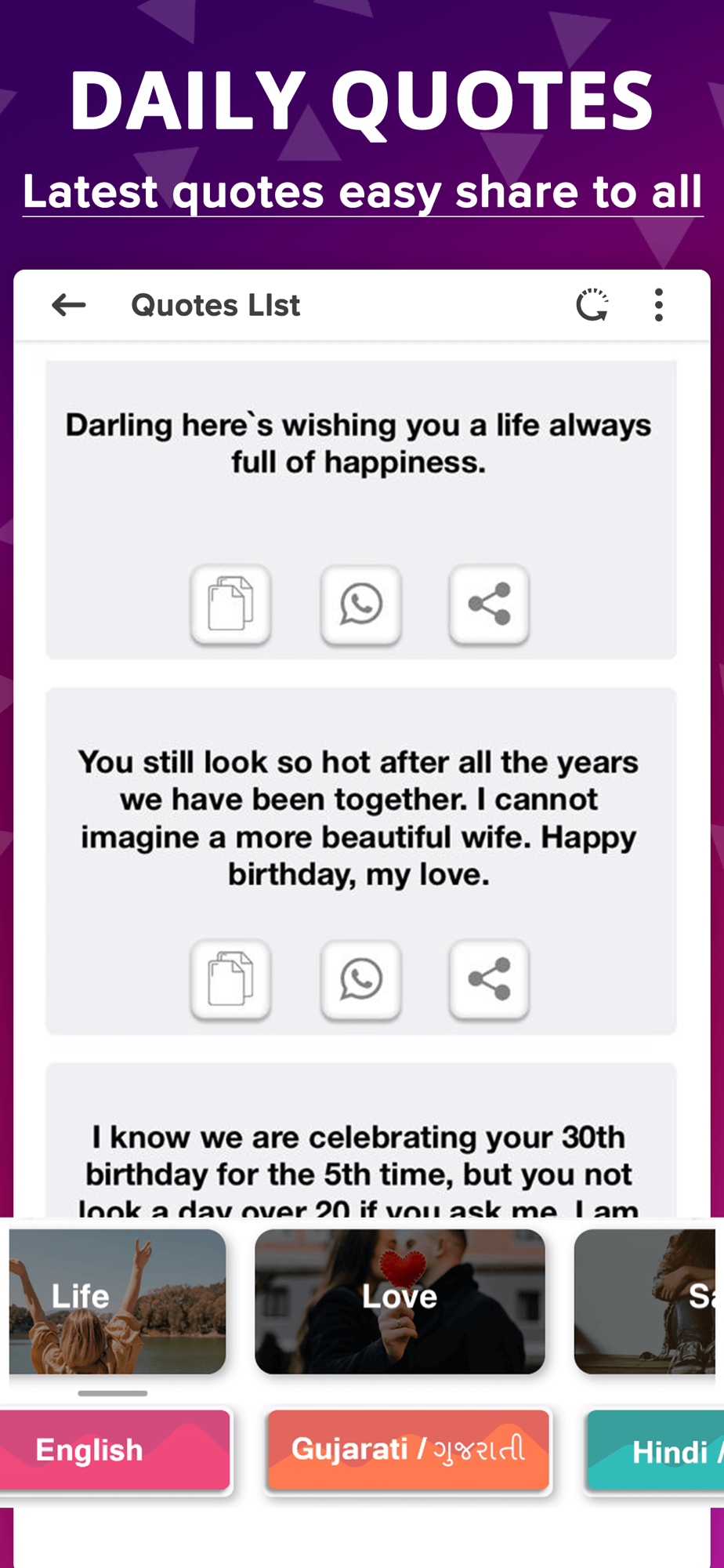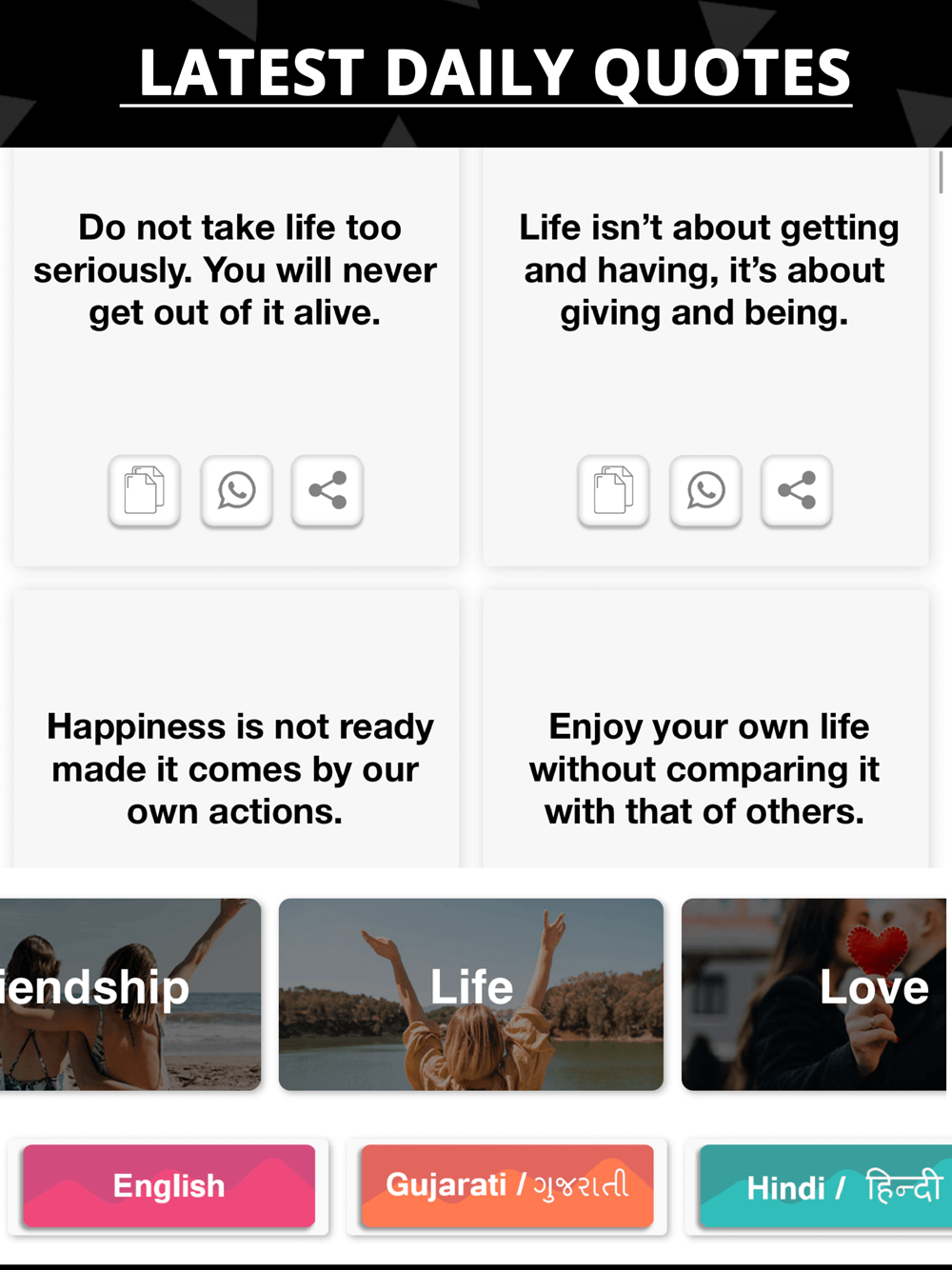 - 10+ languages like English, Hindi, Gujarati, Tamil, Punjabi, Kannada, Telugu, Marathi, Bengali picture quotes and status maker…