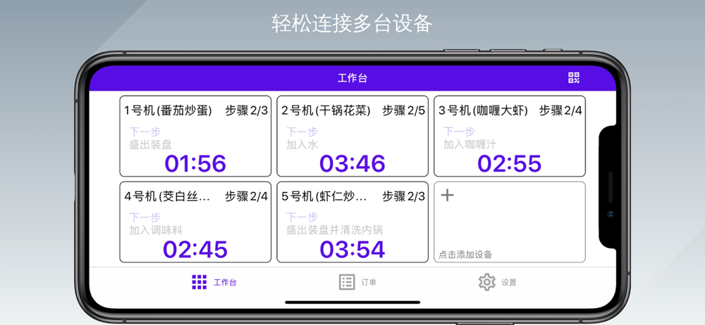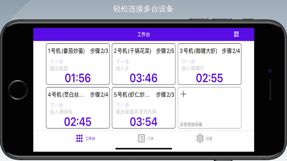 【多台设备联动】利用无线技术,串联多台智能烹饪设备,科学算法分配任务,让每一台设备时刻在线工作,争分夺秒创造利润,联动状态下,1人即可管控6台以上的设备;