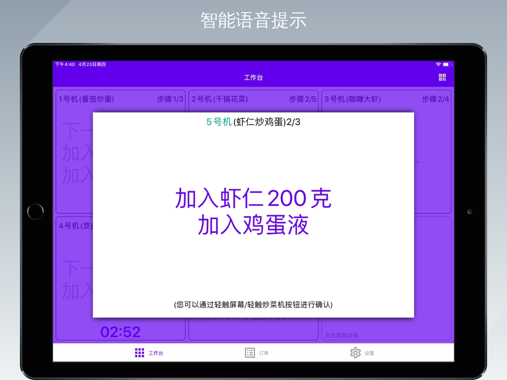 【操作界面投屏】烹饪过程可多屏投放,前厅食客亦可实时观看烹饪程序执行,增加餐厅吸睛指数