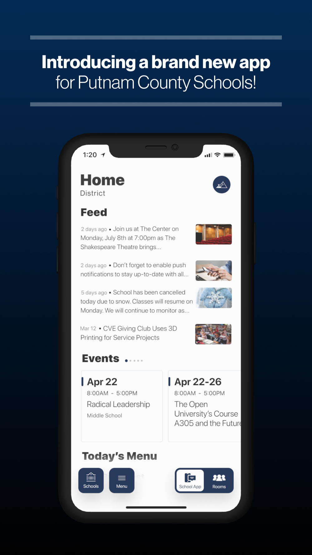 The event section shows a list of events throughout the district. Users can add an event to your calendar to share the event with friends and family with one tap.