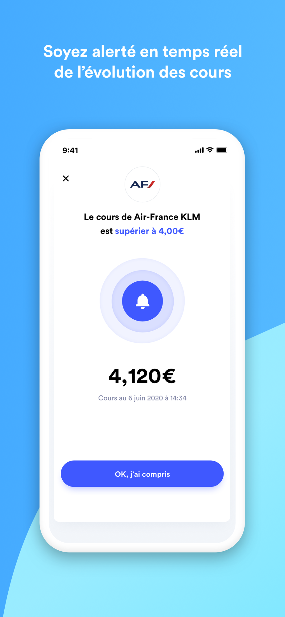 - Alertes, cette fonctionnalité permet de recevoir une notification push lorsque le cours d'un titre franchit un seuil (à la baisse ou à la hausse).