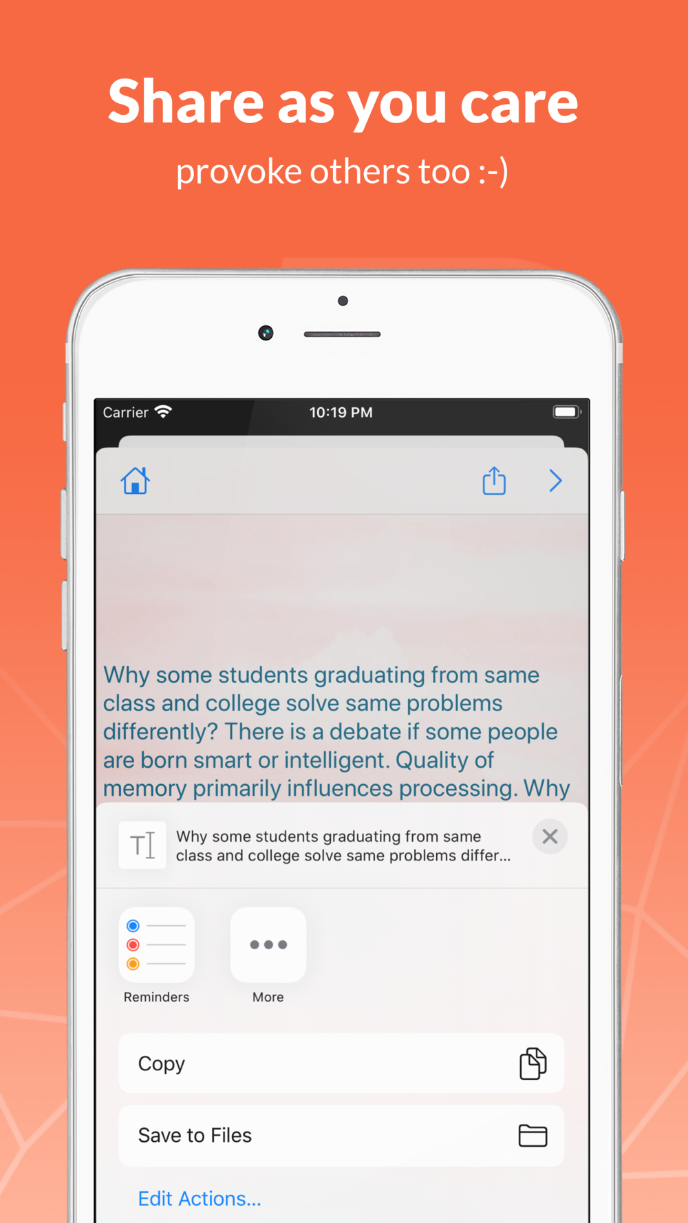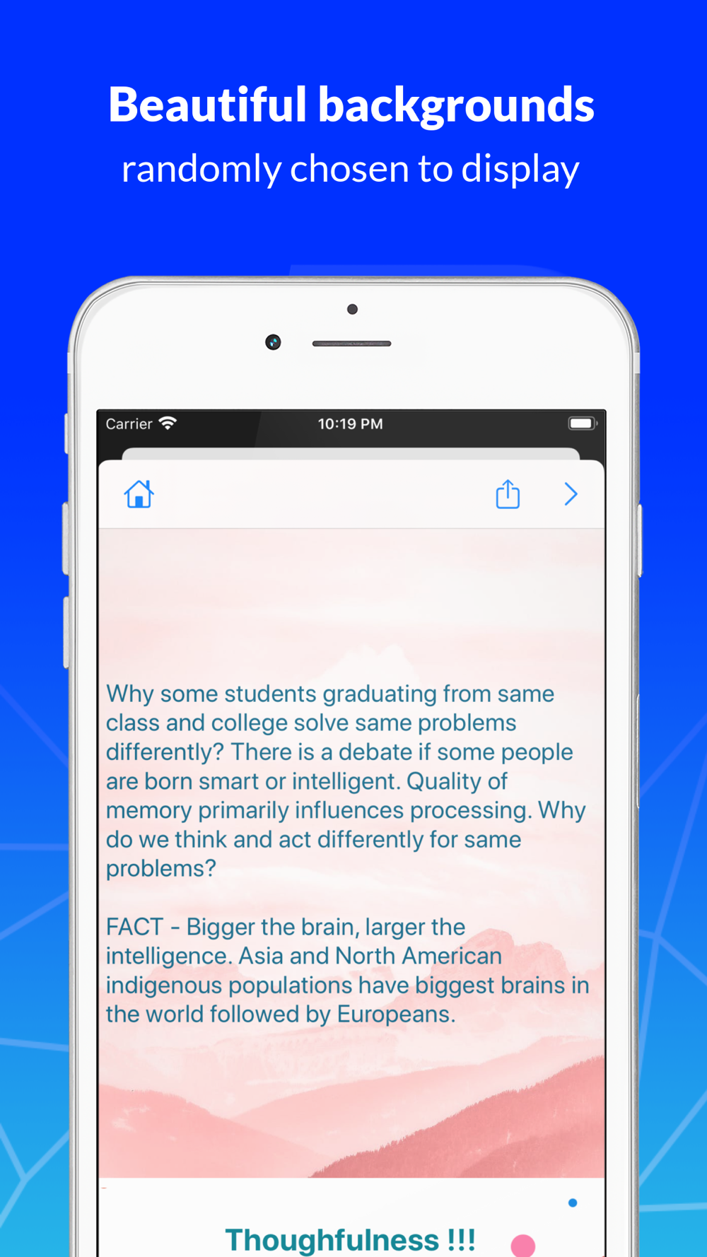 This app will give you access to over 35 thoroughly researched and fact based thought provoking questions and comments with beautiful randomly generated backgrounds that will provoke to change your perspective for guaranteed success. Share as you care. Take a short quiz based on true facts to test your learnings.