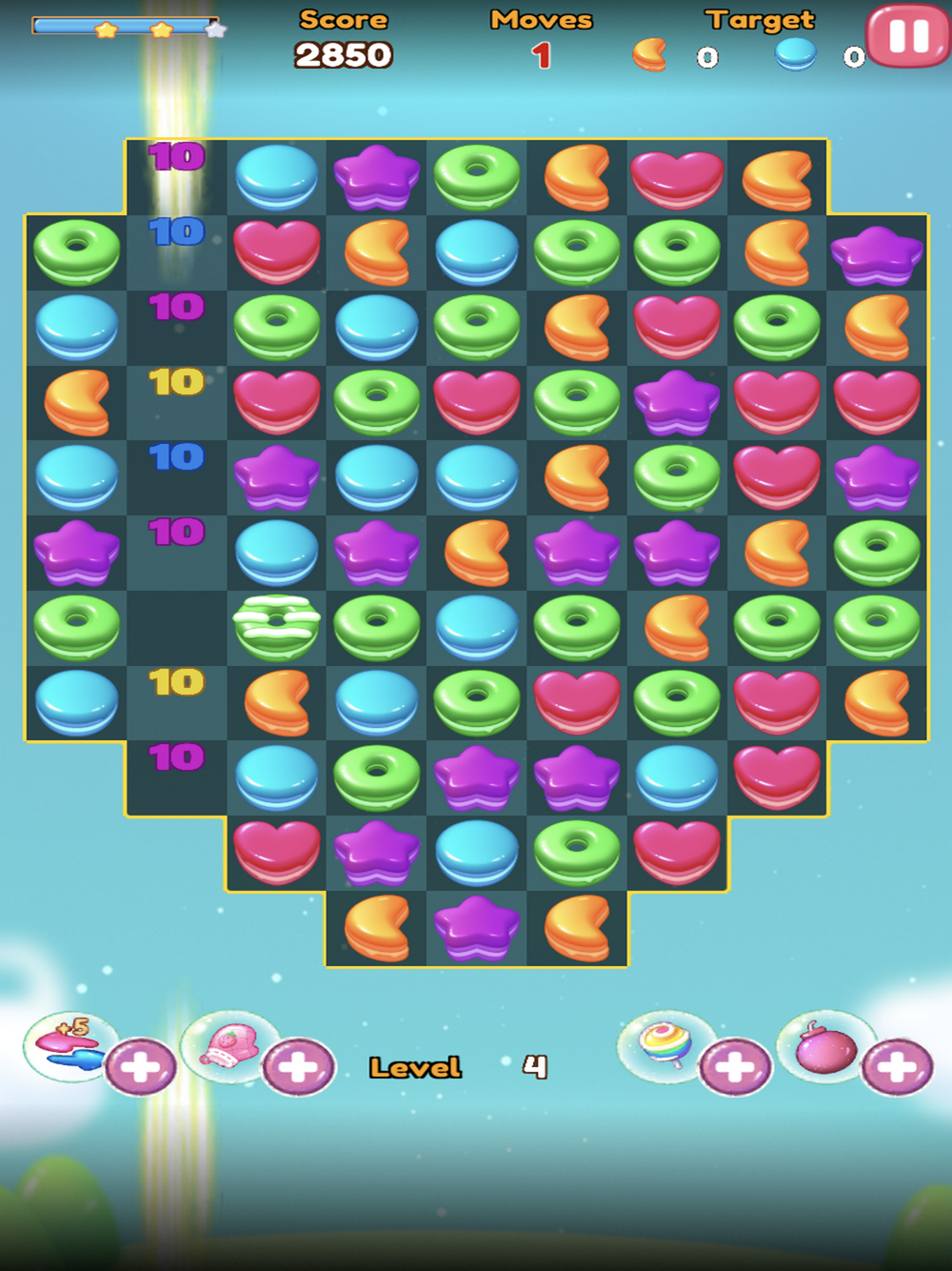 * الحصول على 4 حلويات متطابقة معا إلى رذاذ الفاكهة والحصول على علاج مخطط من نفس اللون ، الذي يكسر خط كامل;