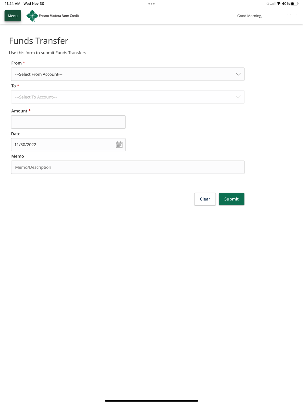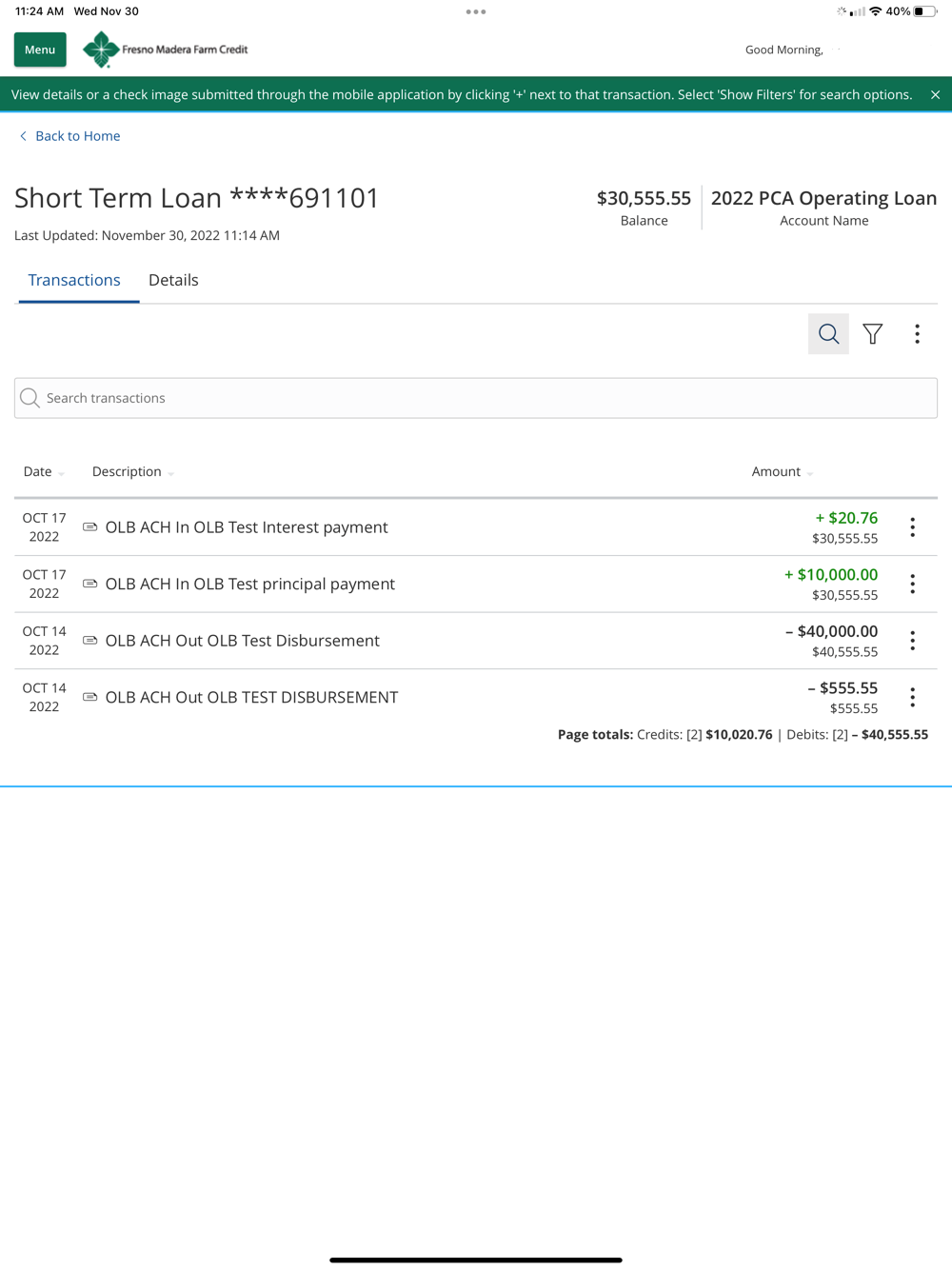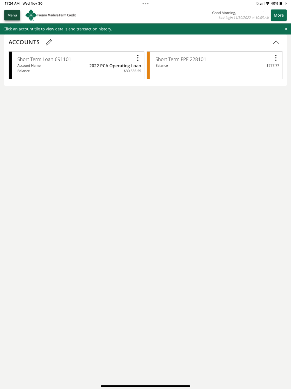 FMFC mobile banking provides customers with a convenient and secure service to view and manage your farm credit lending accounts. Access your accounts 24/7 from any location. Our application allows you to check balances, view current and historical transactions, create and approve funds transfer, and process disbursements and payments.