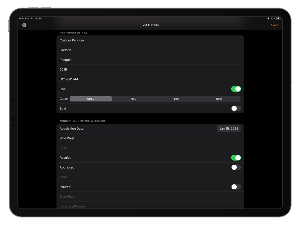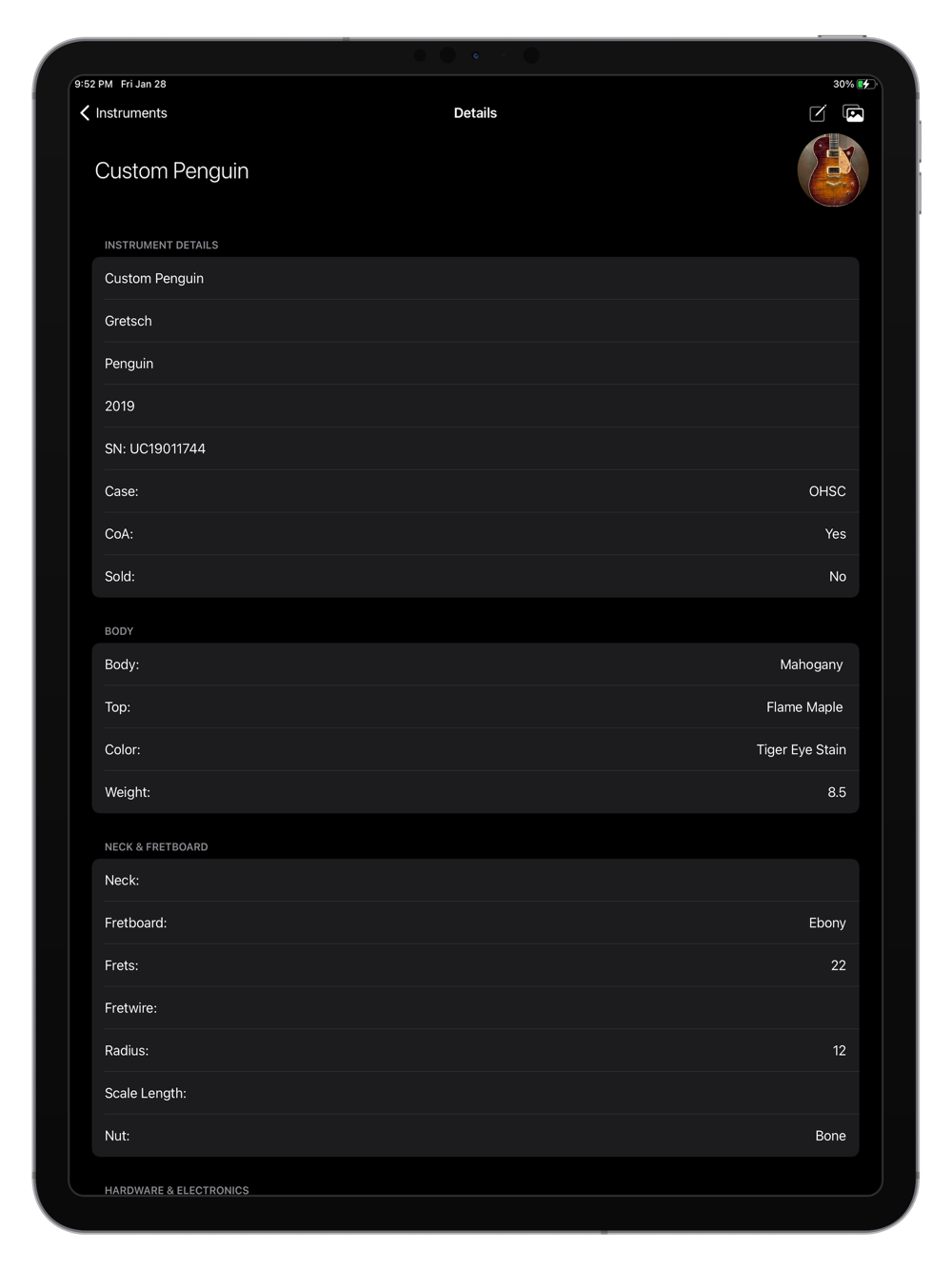 GuitarStand for iPhone, iPad and Apple silicon Macs allows you to store data on your instrument collection. Data includes brand, model, serial number, body information, electronics, hardware, purchase information, and more. You can also add multiple photos of each instrument. Data syncs across your Apple devices and can be exported to a csv file and subsequently opened in your favorite spreadsheet program such as Excel and Numbers on any desktop device (e.g., Windows, Mac) as well as on mobile versions. GuitarStand is great for record keeping and can be helpful when getting your collection appraised or insured. Whether you are a professional musician, collector, or instructor, you can keep track of information on all your instruments.