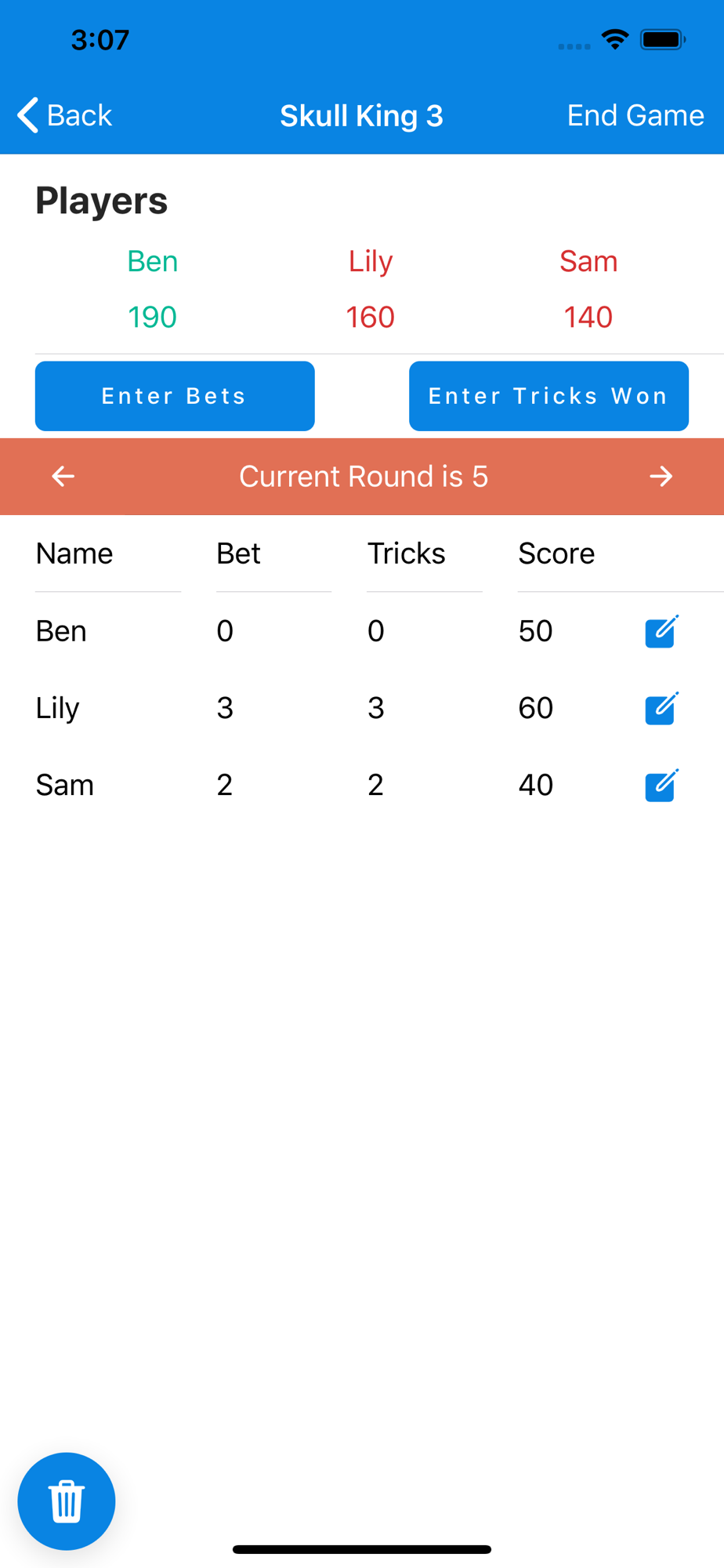 When entering the tricks be sure to enter the pirate and skull king bonuses before you enter the number of tricks won. If you need to make changes, you can click on the edit button next to a user.