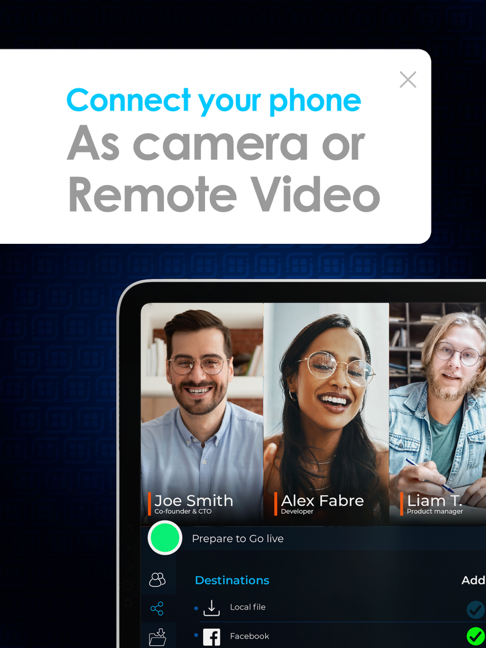 With Live2Social you can capture video from multiple camera angles simply by connecting your iOS devices (iPhone or iPad) - to an third-party platform device on the same wi-fi connection or connect with invitation link as a remote guest no matter the location — and edit it in real time —