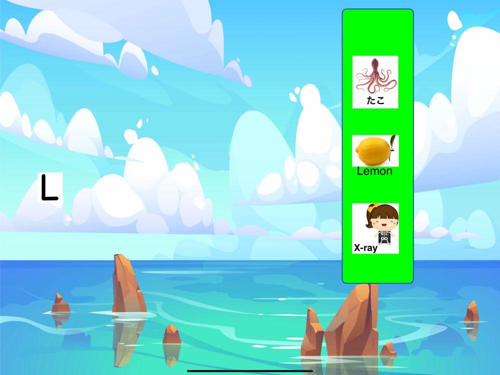 Practice matching letters and kana with words. The player drags letters and kana onto images which have labels starting with that letter or kana.