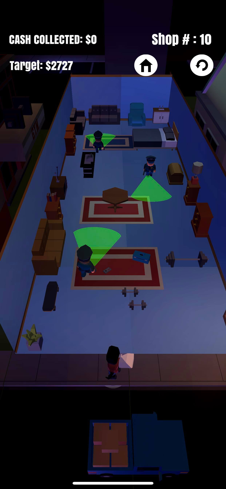 Steal as many items as you can while evading the police. Take your finger off of the screen while playing to hide yourself beneath a box and fool the cops. Once you've stolen enough goods you can run back to the getaway car and scram!
