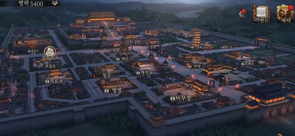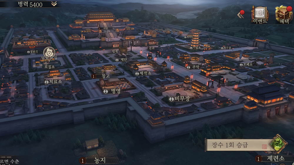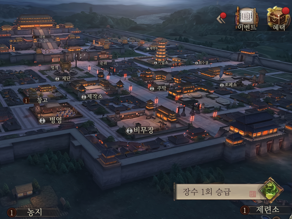 주성을 건설하여 장수 육성, 자원 생산, 계략 모색, 무기와 기법 연구 및 병력을 강화하라!