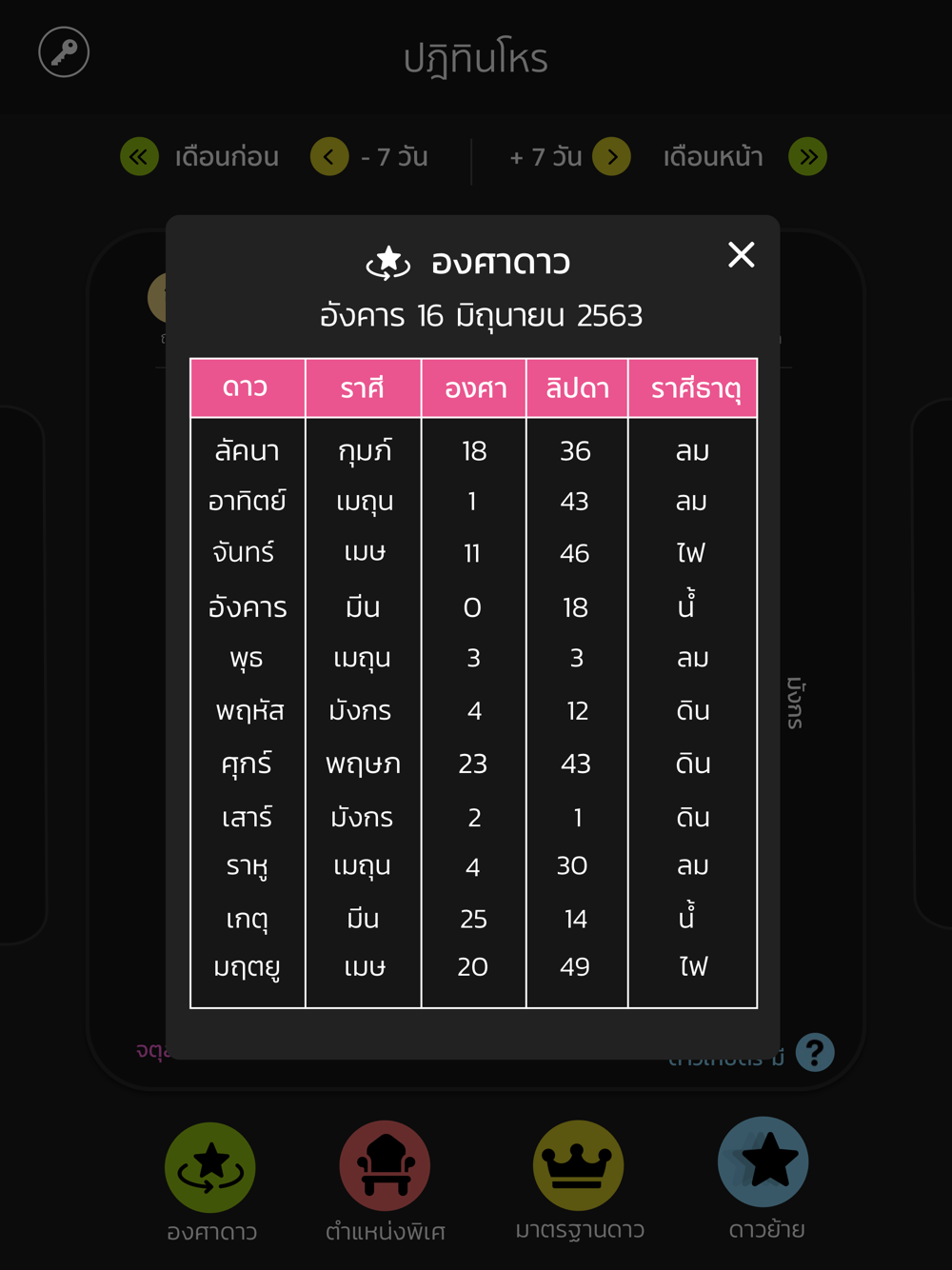 - แสดงตำแหน่งพิเศษต่างๆของดวงดาวในวันนั้นๆ เช่น เสี้ยวจันทร์ ตรีโกณ จตุสดัย ฯลฯ