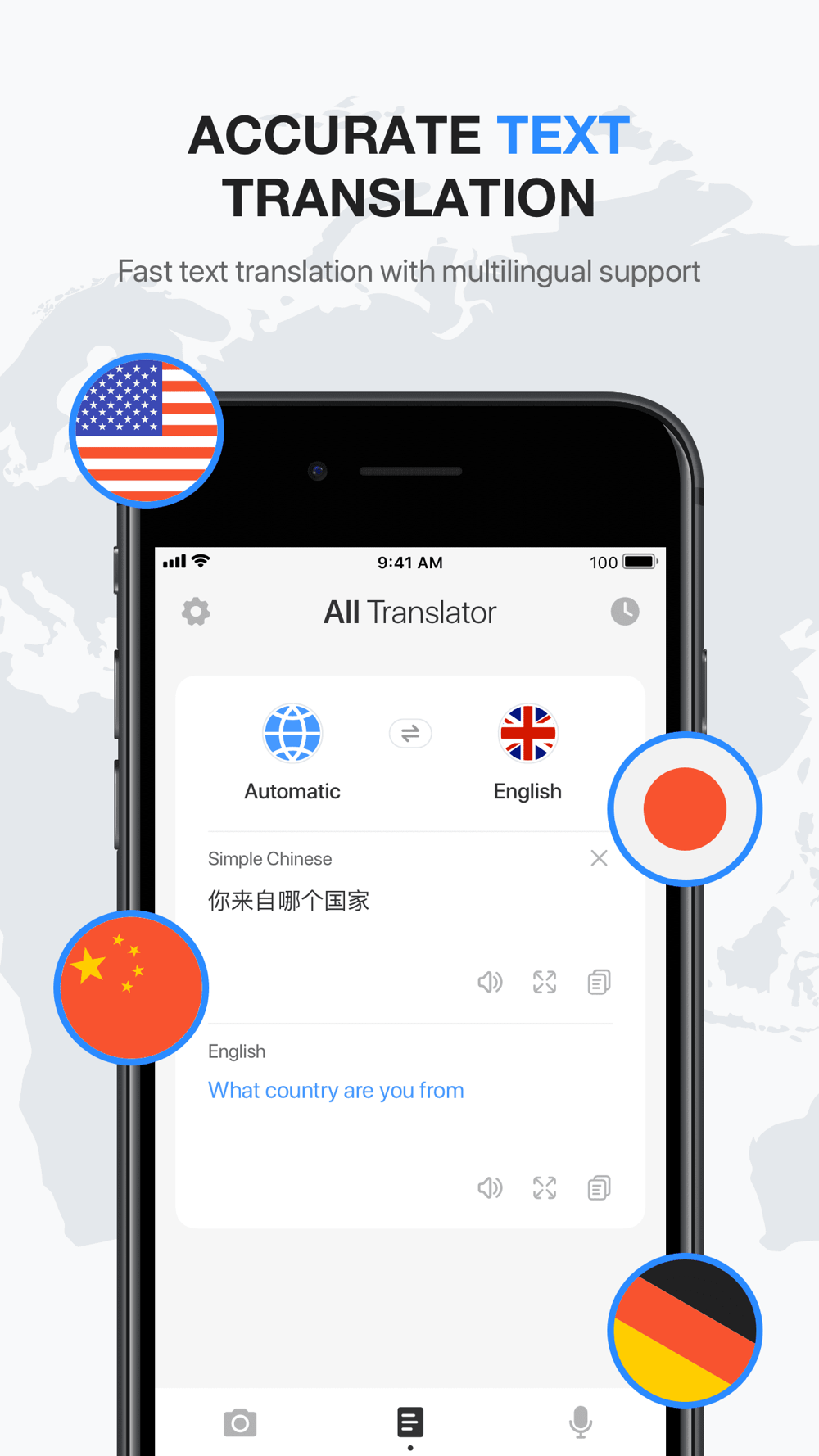 All translator is an efficient, accurate and powerful multi language translation & dictionary application. It supports translation in more than 100 languages, easily real-time translation of text. Photo translation, voice translation and dialogue translation make your communication more convenient, it is an intimate "translation partner" for your life, work, study and travel.