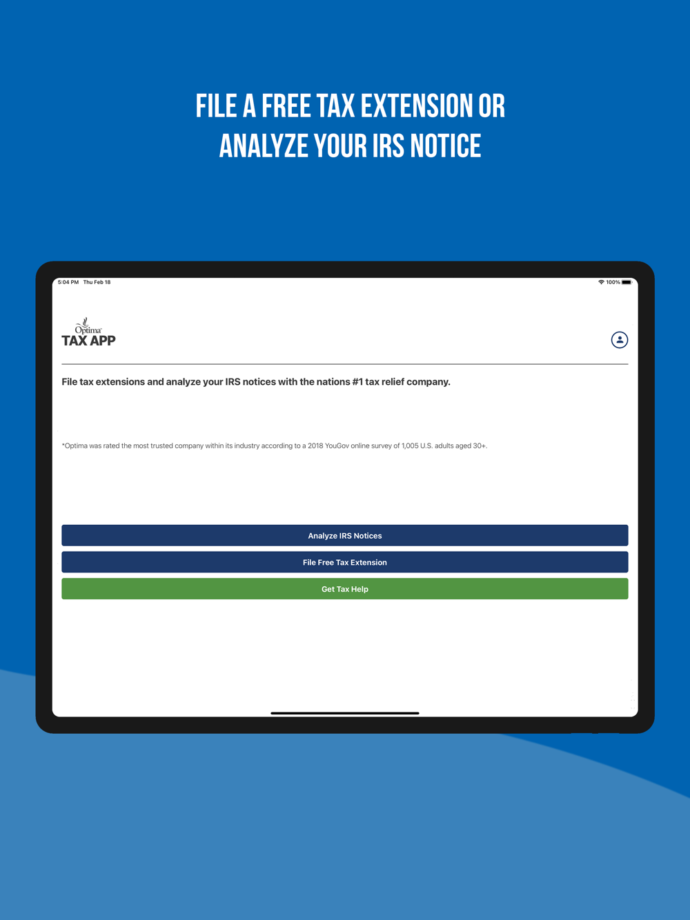 Need more time to file your taxes? Confused or scared by a letter the IRS sent you? Help is here! File a free tax extension and analyze your IRS notices with the Optima™ TAX APP – The Tax App for People Who Owe!