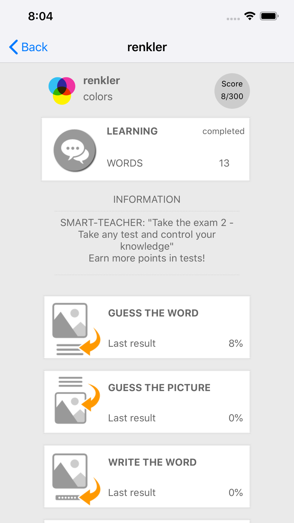 - Testing of the knowledge of the words happens through fun and simple tests: