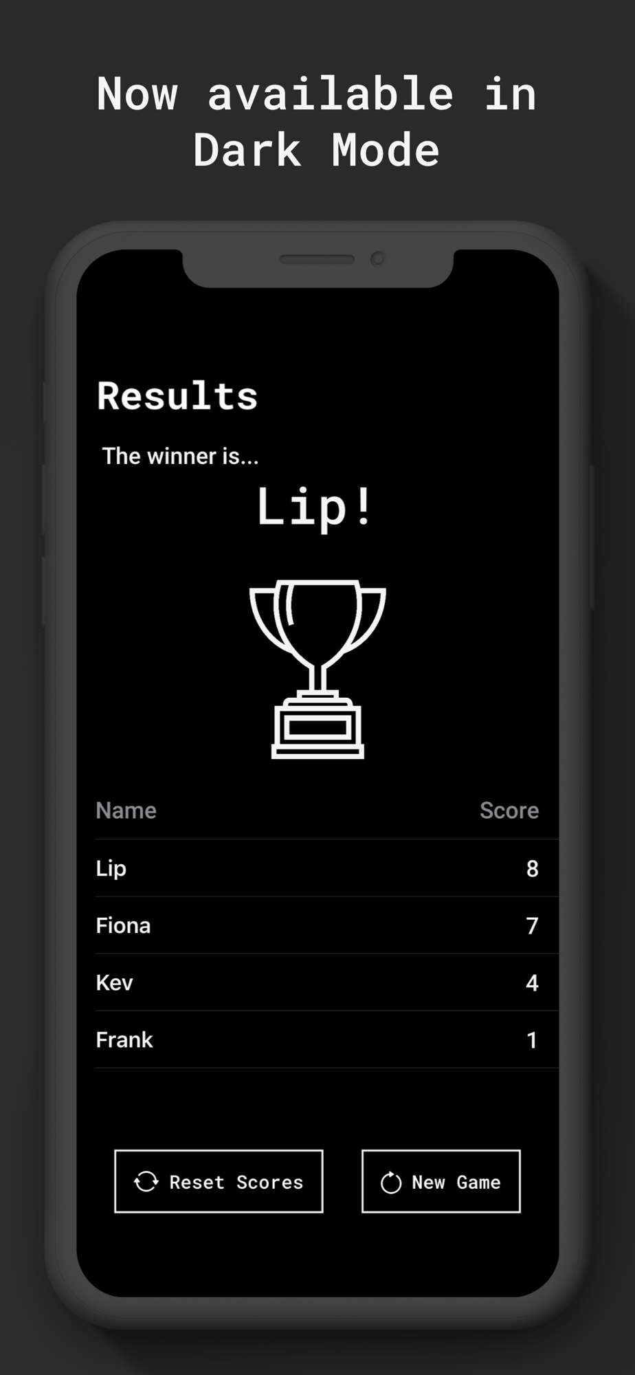 Specifically designed for black card games to be simple-to-use so you can quickly increase a player's score while in the middle of a round.
