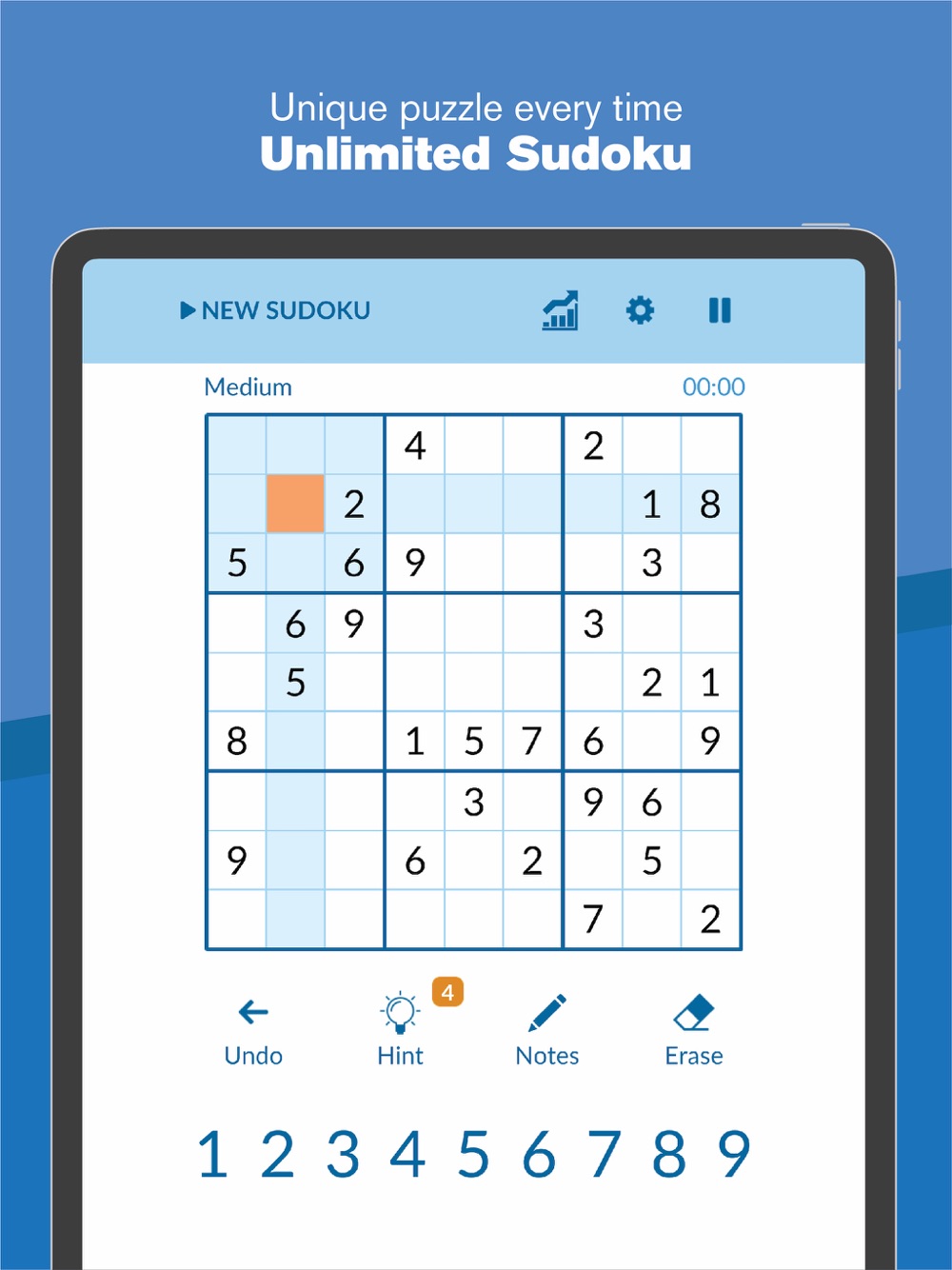 Sudoku Titan has very useful tools to improve your puzzle experience. Highlighting duplicate numbers, hints, notes even undo is possible. You can easily restart your game from the "New Sudoku" menu.