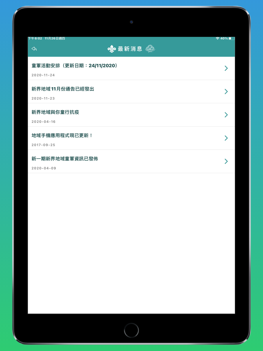 To enhance the efficiency of information dissemination , New Territories Region has enriched the mobile application, and further optimized the program so that scout leaders and members can access to the latest NTR information and scout training materials effectively.