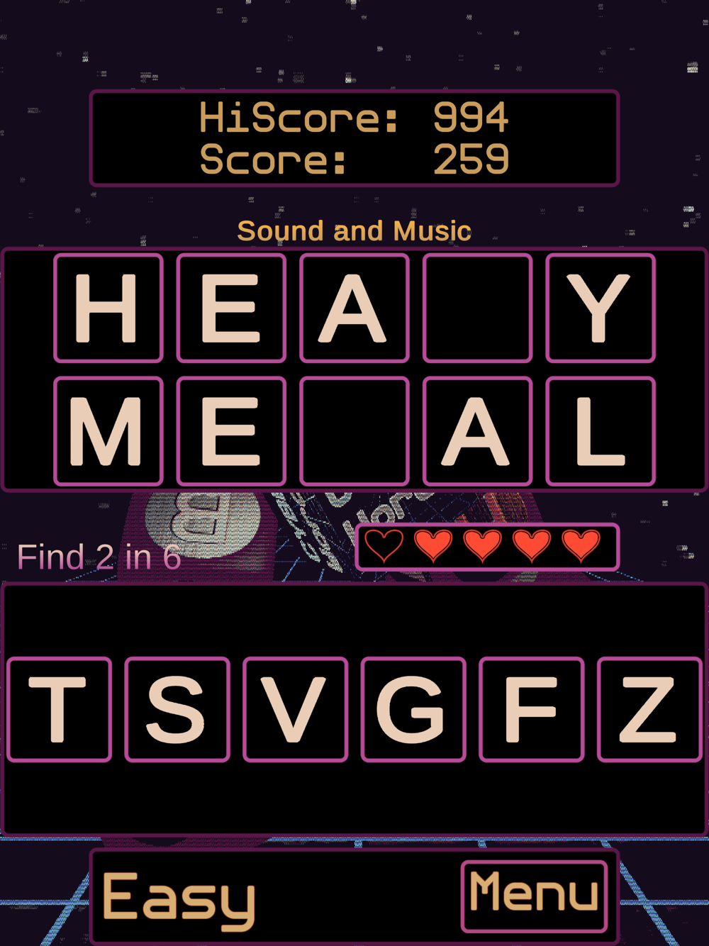 Game will give you a set of 6 letters, where 3 letters are from the puzzle and 3 are not. Pick correct ones and you will get a new set, until you solve the puzzle or run out of lives.