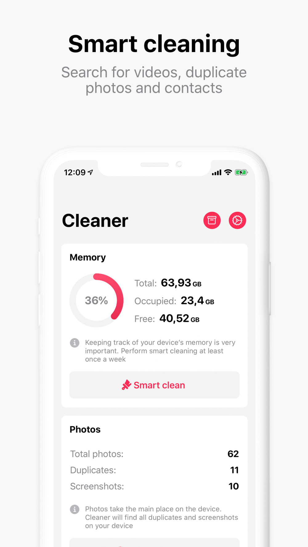 ProClean is one of the most advanced cleaners on your phone that lets you find and delete duplicate photos, merge duplicate contacts, or delete larger videos.