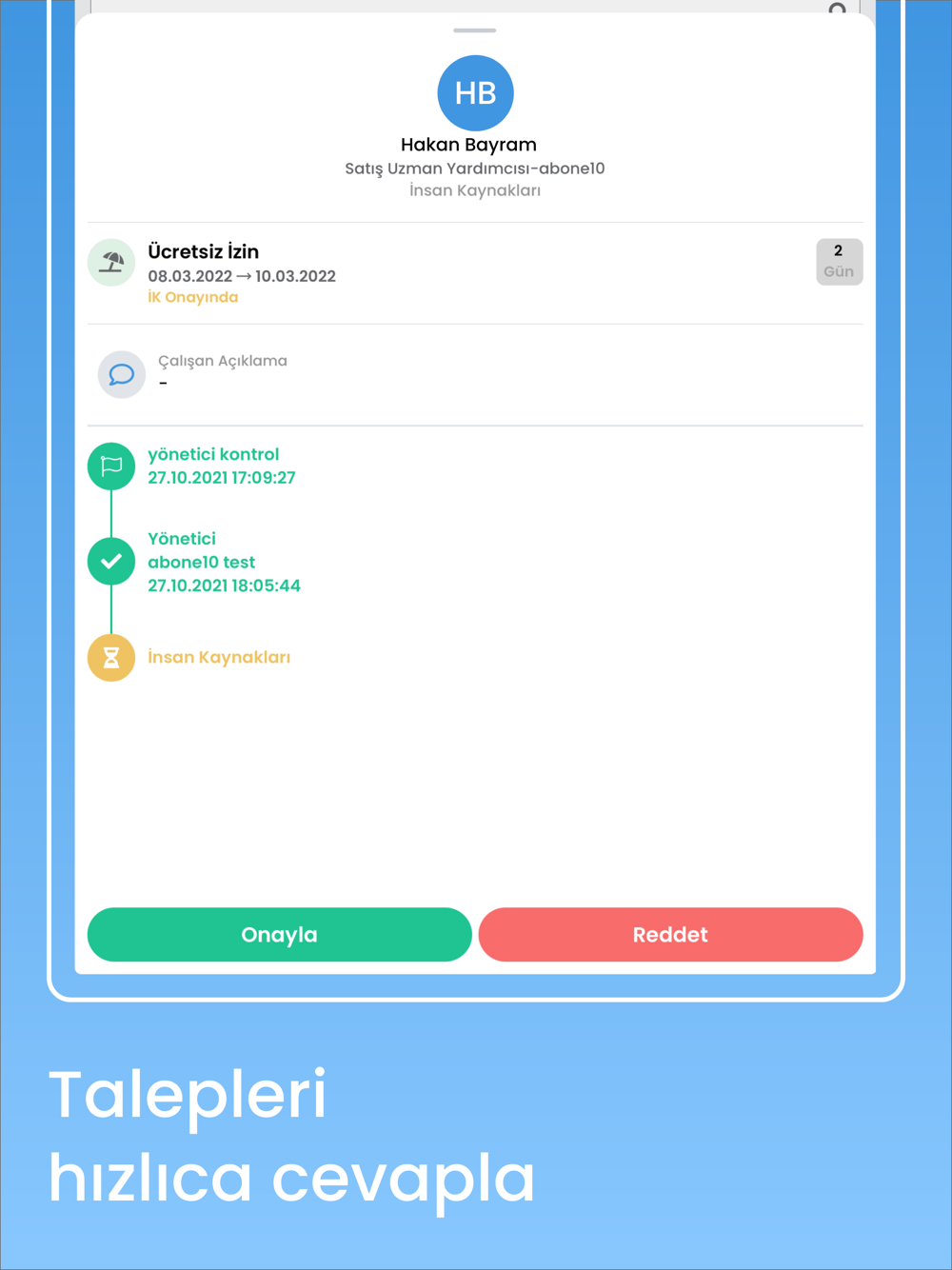 Sistem üzerinden kuruma özel izin tanımlarınızı esnek olarak tanımlanabilir. Çalışanlar self servis üzerinden izin taleplerini oluşturabilir ve izin sürecine ait bilgilerini görüntüleyebilir. Yönetici veya insan kaynakları olarak çalışanların izin taleplerini takip edilebilr.