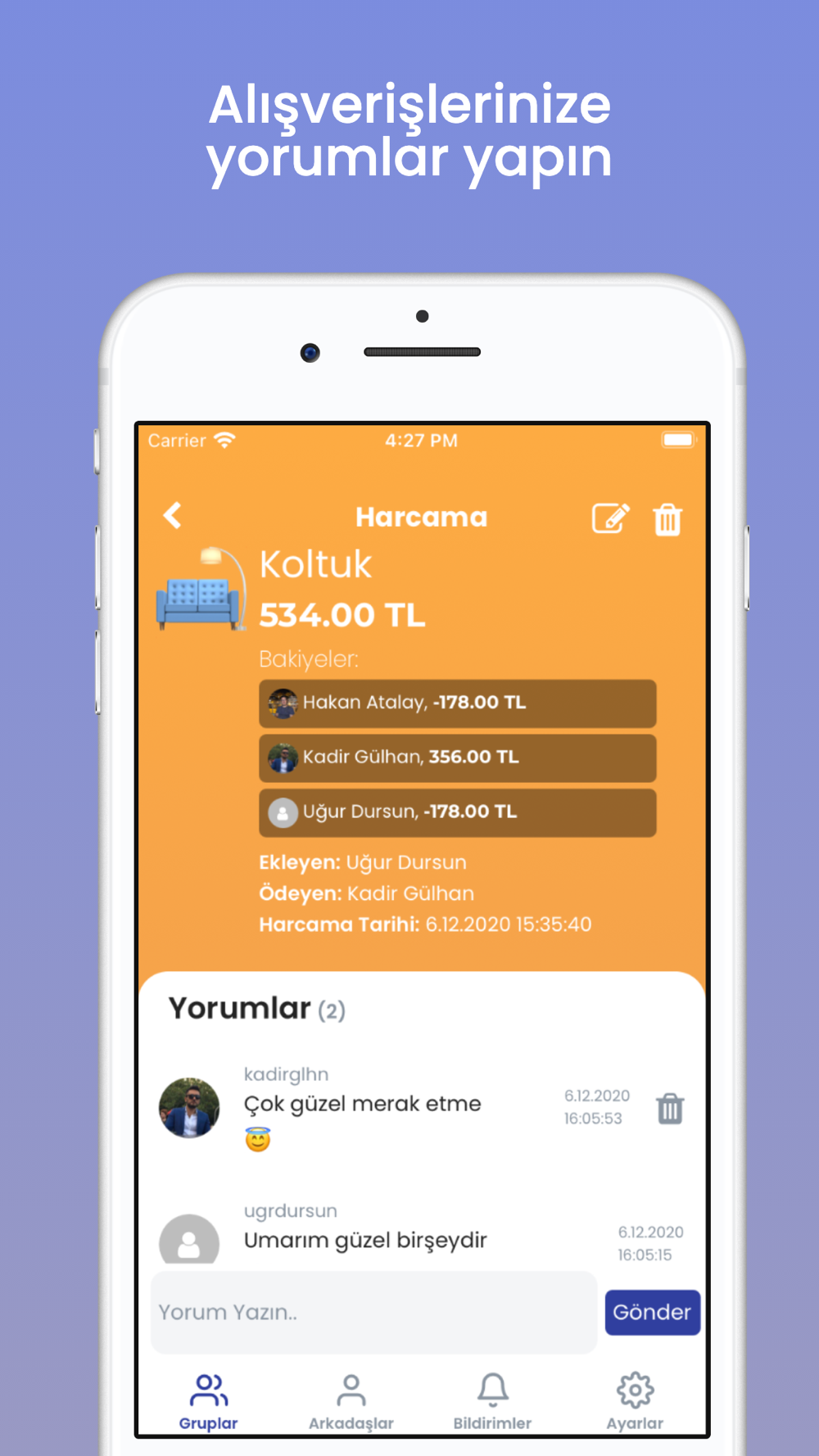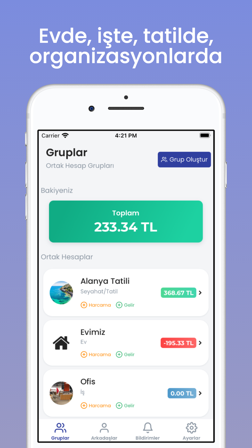 Ortak Hesap ev arkadaşınızla, iş arkadaşınızla, iş ortağınızla, eşinizle ve benzeri tüm ortak para kullanımında olduğunuz kişilerle hesapları kolayca takip etmenizi sağlar.