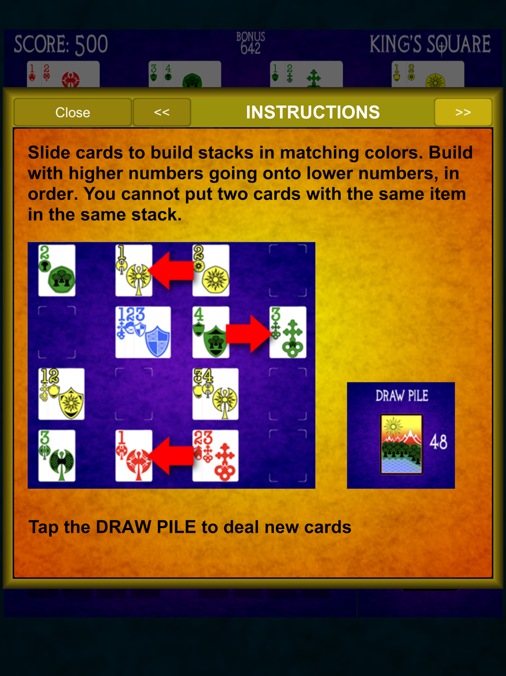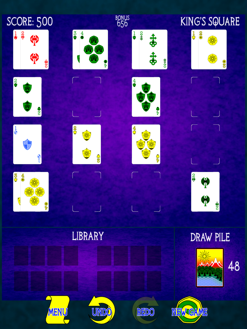 Combine Colors, Numbers, and Items in this challenging new solitaire game utilizing the custom KING'S KEYS deck of 64 cards. Comprising FOUR colors, FOUR numbers, and FOUR items, the deck is a CUBE of possibilities! Do you have what it takes to complete all of the books and win the day? Give it a try and find out! But be careful... it's highly addictive!