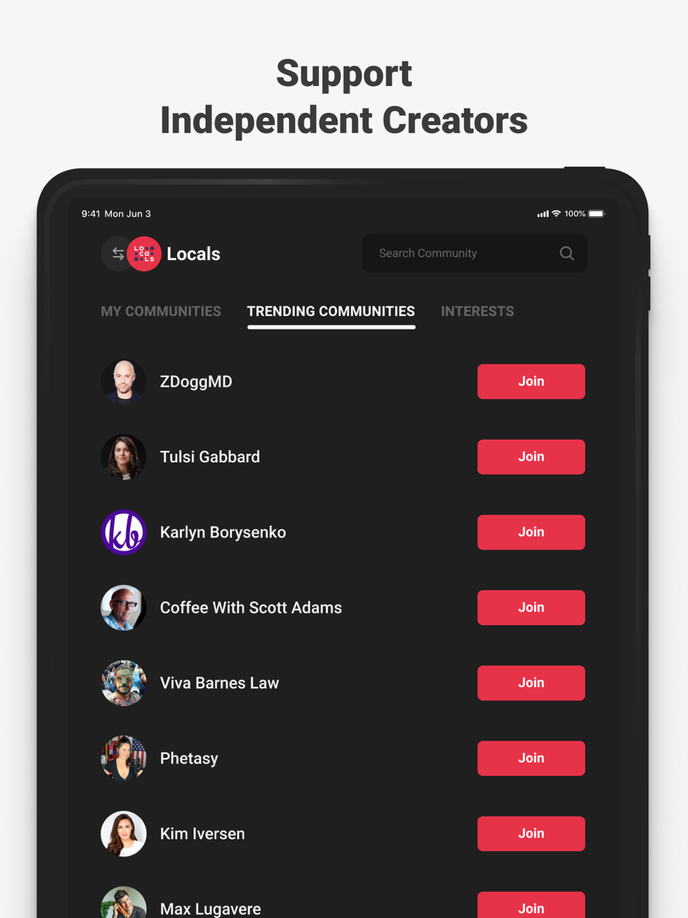 Control your content and avoid the algorithms. Built from the ground up to champion the needs of creators, Locals does not sell your data and creators have unprecedented ownership over theirs. With features like live-streaming with chat, community feeds and posts, and content libraries for video and audio, the Locals app is an all-in-one solution to interact with the content you love, while directly supporting the independence of the communities and creators you care about.