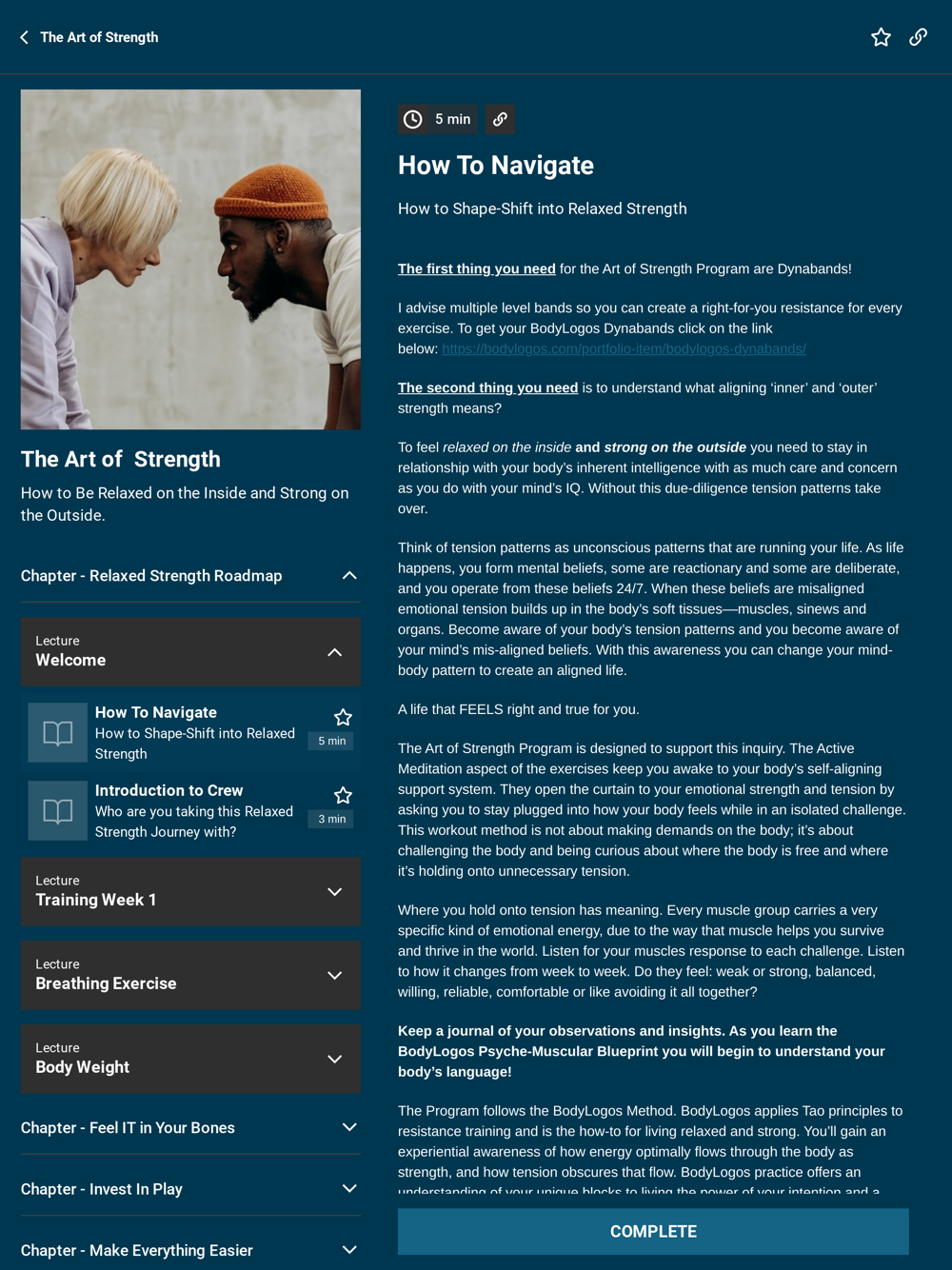 As a Broadway dancer turned Tao Minister, my mind-body strength method––BodyLogos––unites principles from Eastern and Western philosophies. My book, “The Art of Strength: Sculpt the Body - Train the Mind,” Balboa Press 2019, offers the nuts and bolts of the BodyLogos Method. Now, with The Mind Body Adventure App, you can implement that information easily with virtual workouts and coaching that create positive lasting change.
