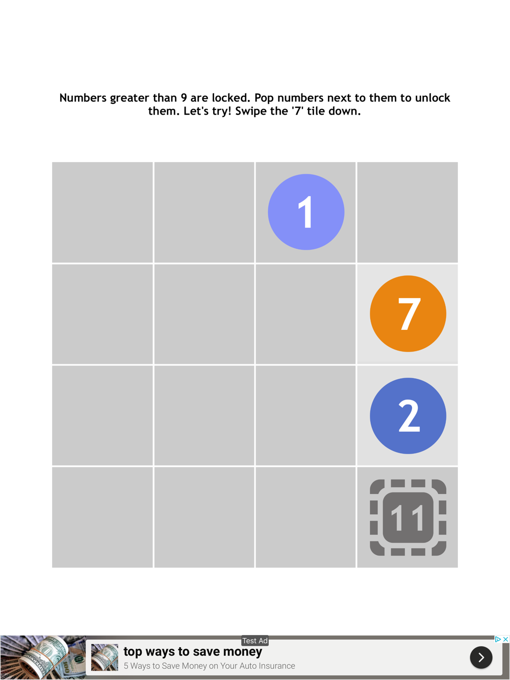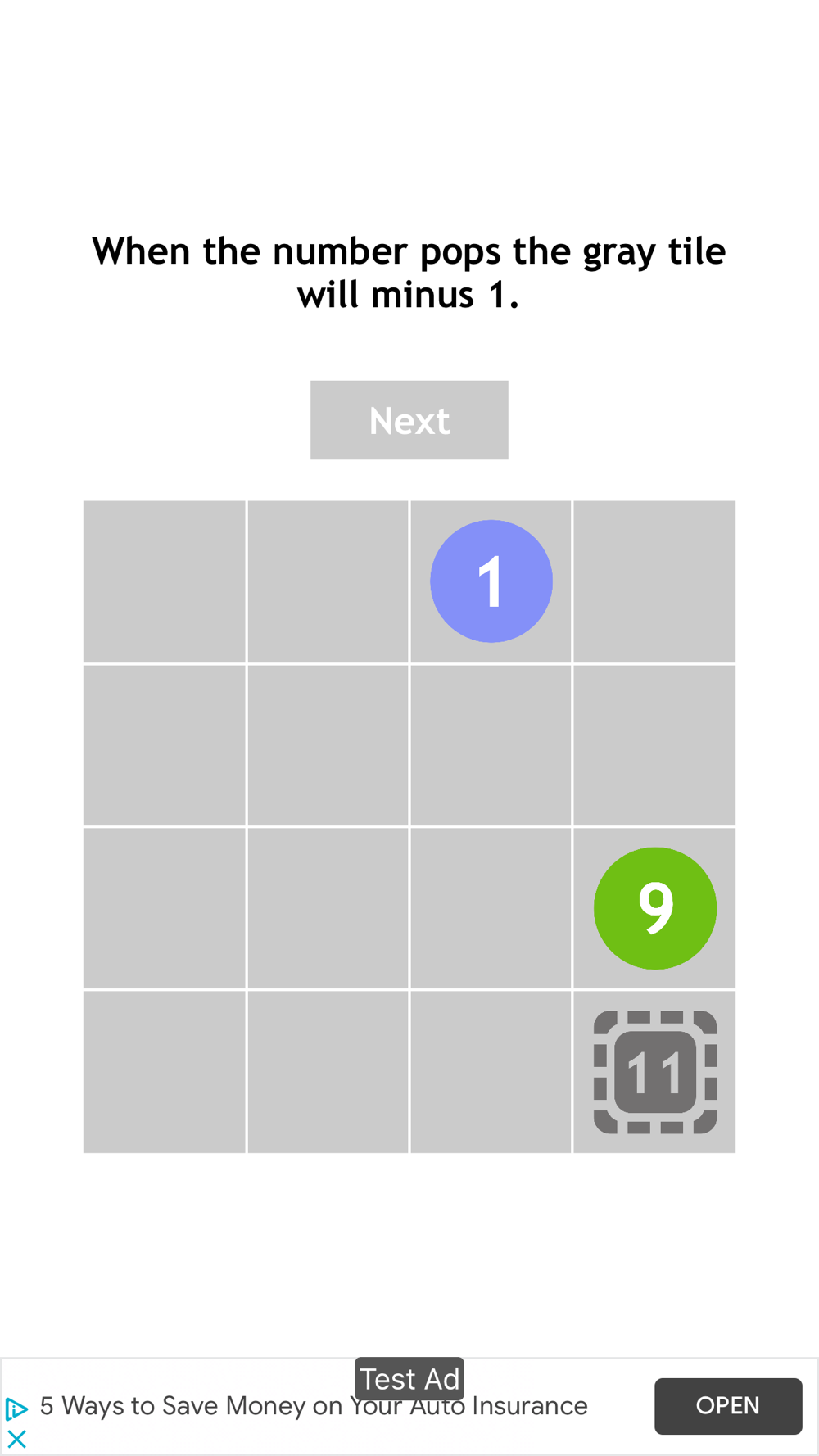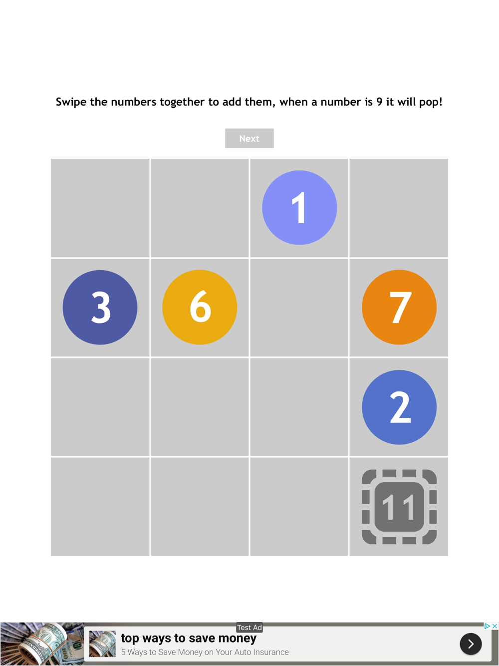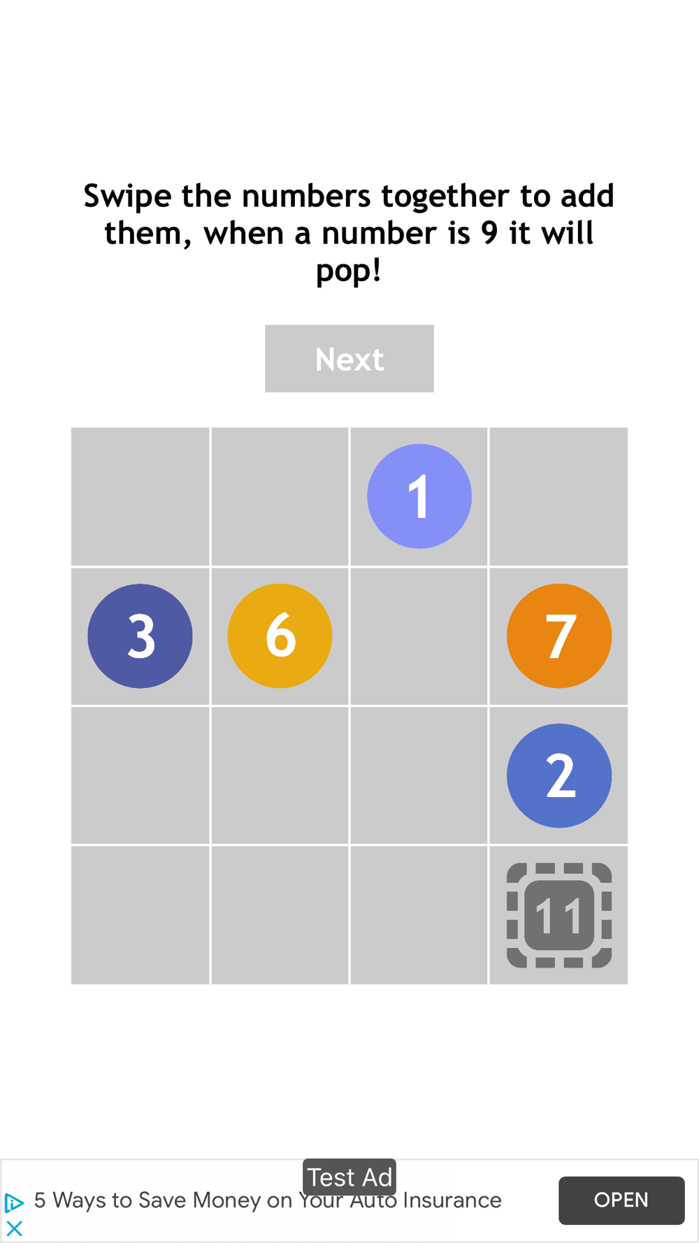 Swipe to move the tiles. When two tiles merge, the numbers are added. When the value of a tile is 9 it pops and you score a point.