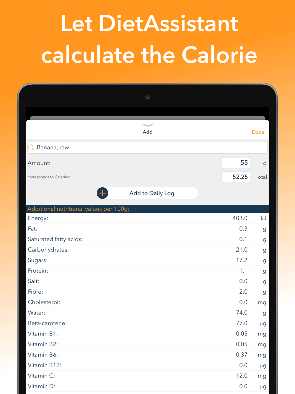 Get the Calorie content of your eaten foods calculated by DietAssistant and save them into the Daily Log. Thanks to the progress bar you will always know how much calories you can still eat.