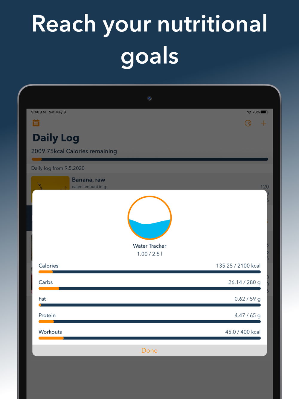 DietAssistant counts Calories, Fat, Carbs, Protein and Water for you. With all these values counted for you, you have the perfect overview of your nutrition. You can set custom goals for your nutrition and your weight in the settings.