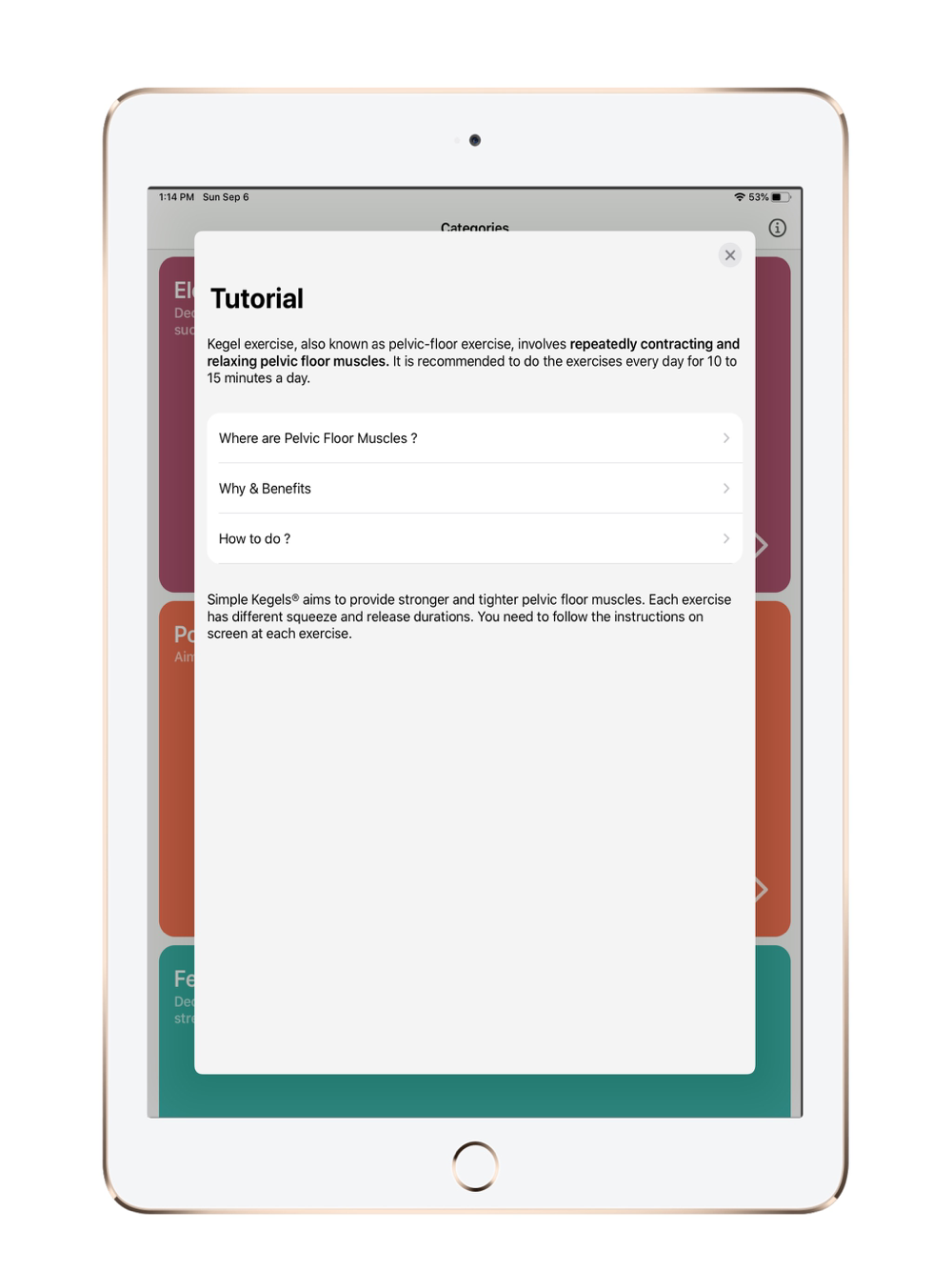 Simple Kegels App have been meticulously designed to be as straightforward and user friendly as possible. Subtlety was paramount. While acting as a medium, app itself does not hinder the mind-muscle connection. It has been designed to be launched in an instance, perform in complete discreteness at your will. Simply launch the app and select one of the exercise categories that are curated for specific groups.
