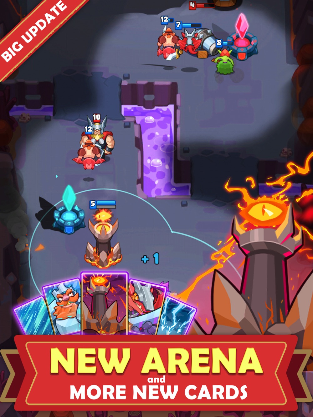 Build your ultimate deck with dozens of cards: Thor, Gumiho, Rocket Tower, Fire Dragon, Jungle Witch, Goblin, Wizard, Sniper,..., and much more. Go to the battle arena, win trophies, and conquer the global ranking.