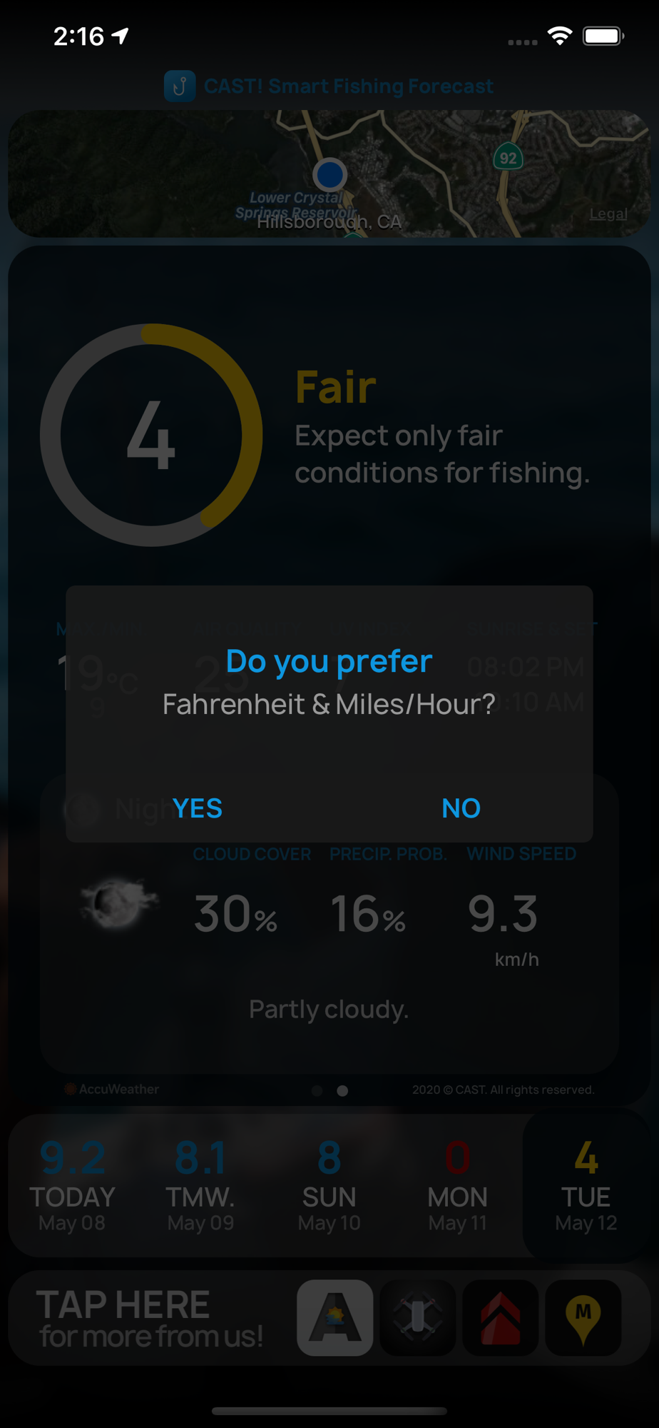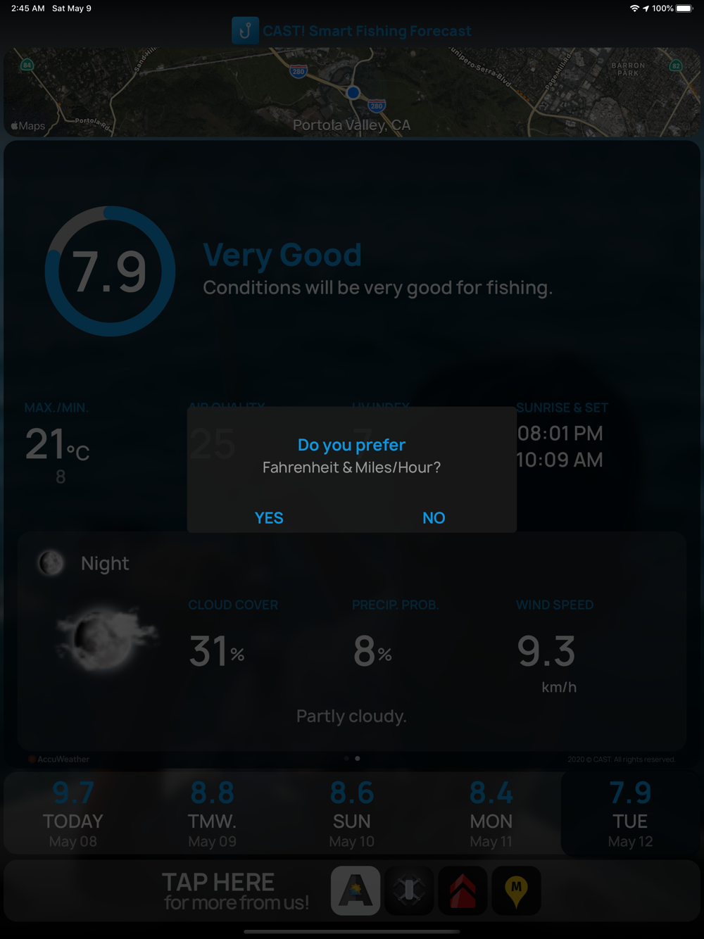 This app combines solunar & weather information to measure the day's peak conditions for fishing.