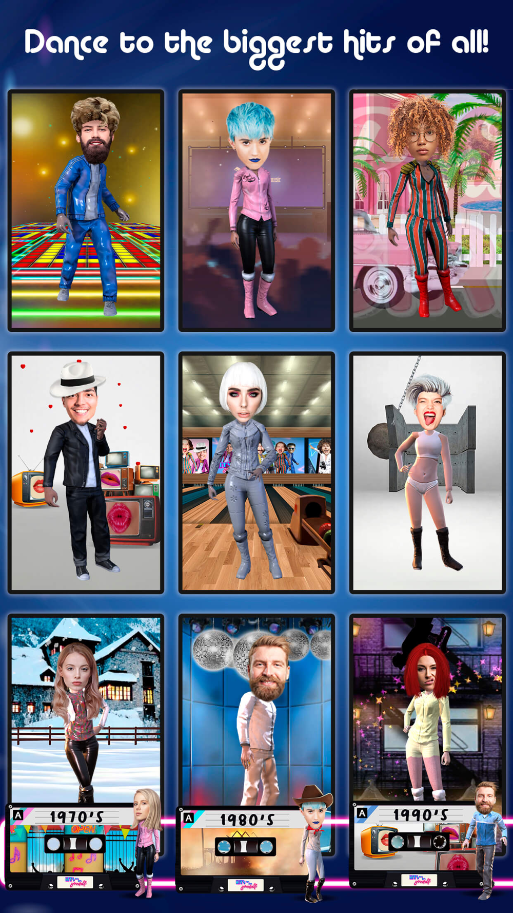 We can tell by the way you use your walk that you love to dance! Download now and place your face in our iconic dance animations to celebrate your favorite decade with the most memorable dance hits from 70s, 80s. 90s and present! From classic to modern, it’s everything you love about the music. We packed the app with the top new and classic dance songs. It’s time to dance yourself with your favorite songs from your favorite decade. Create your own dance video with your friends!