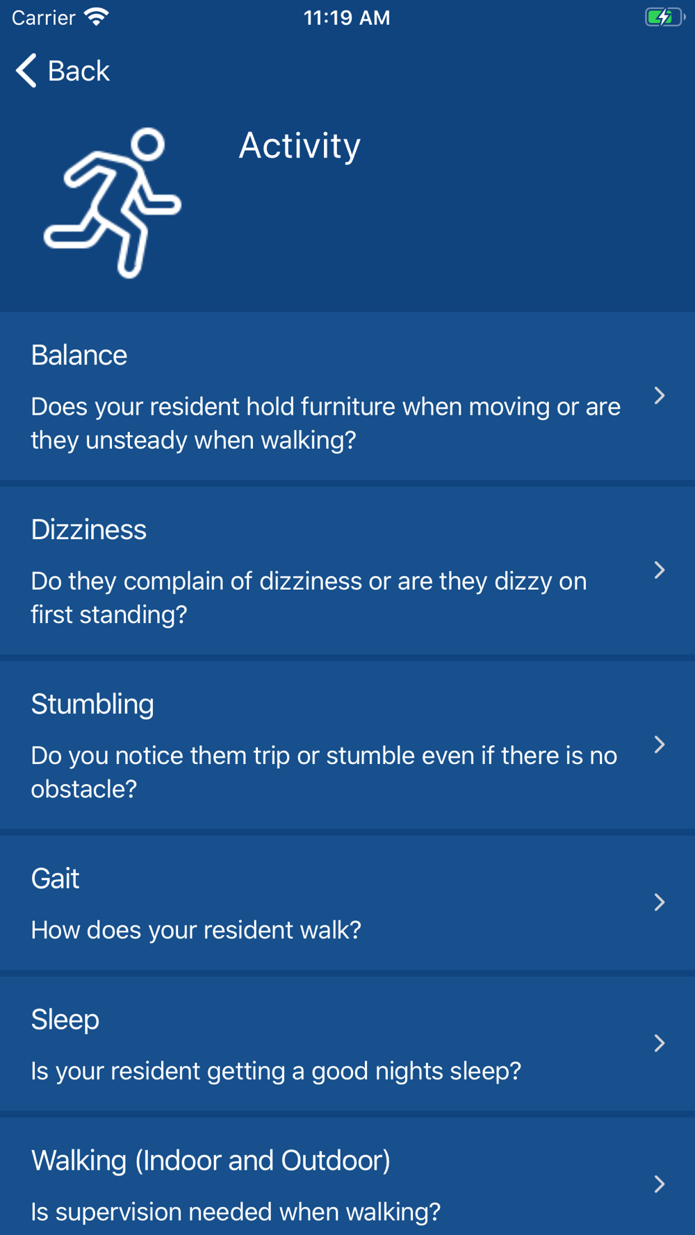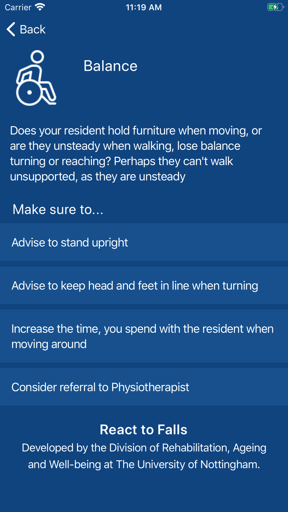 This app can be used by anyone wanting to prevent someone they know having a fall, including residents themselves and their families. It does the following:
