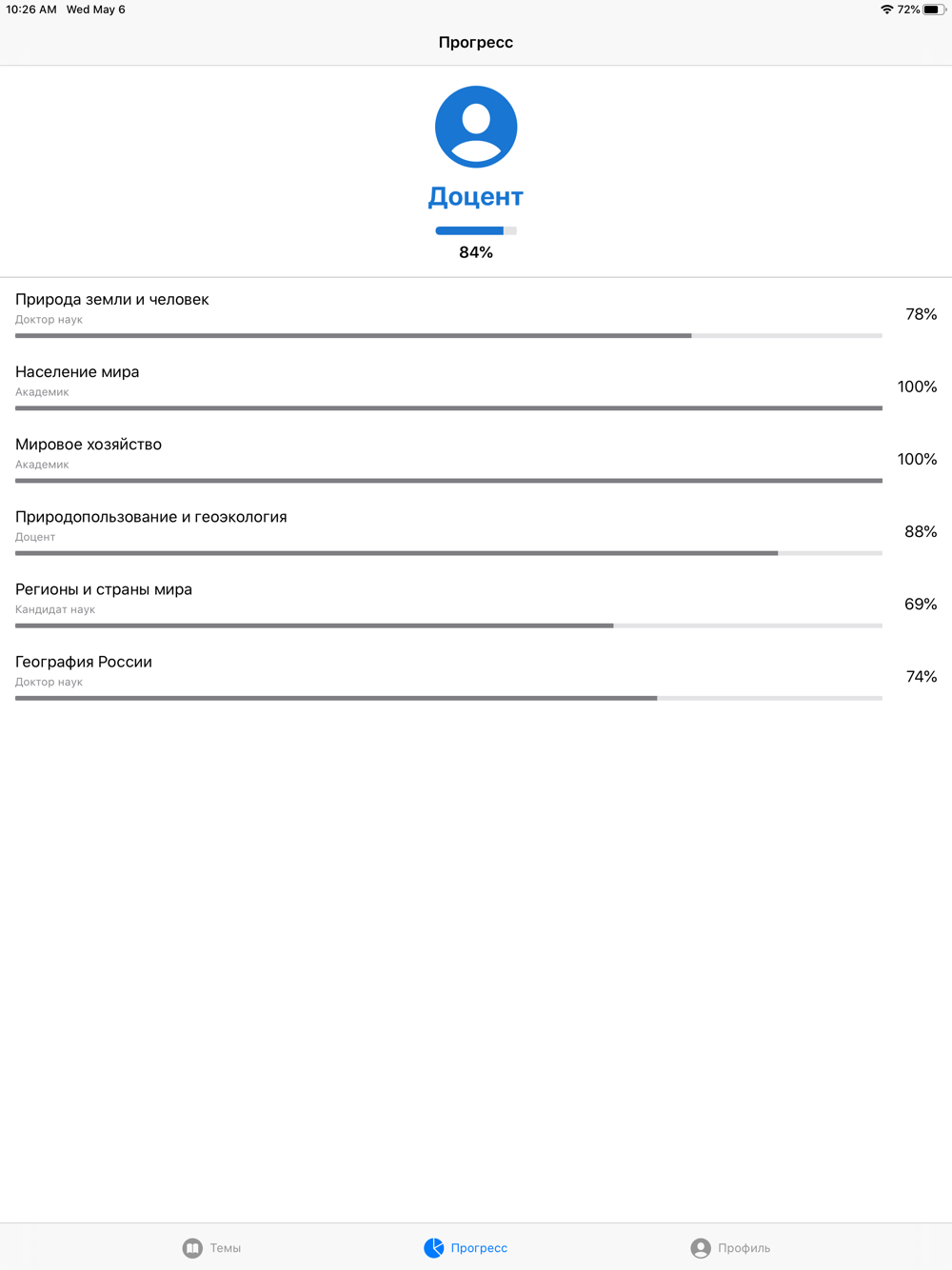 Вопросы распределены по уровням сложности. Базовые уровни затрагивают ключевые области и аспекты географии, что позволит Вам стать настоящим знатоком географии. Углубленный же уровень предоставит Вам возможность почувствовать себя настоящим экспертом в области географии, так как от Вас потребуется глубокое знание изучаемого предмета.