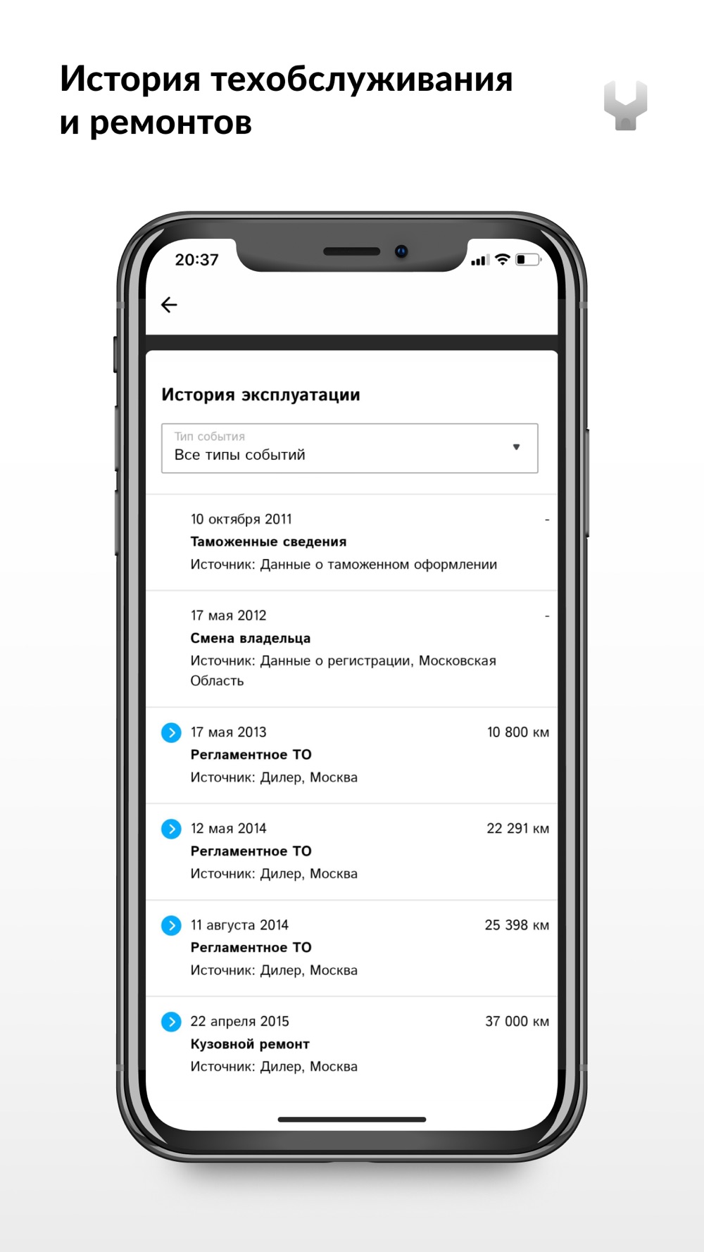 История эксплуатации. Отчёт покажет, что происходило с автомобилем: растаможка, перерегистрации, кузовные ремонты, техосмотры и другое.