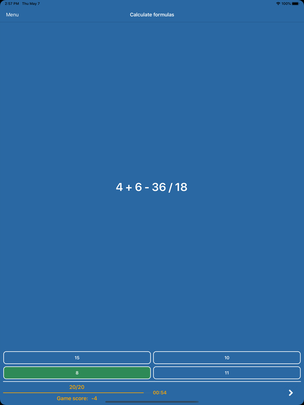 You can see statistics by choosing the menu item in the Main Menu. Information includes the overall score, accuracy, count of correct and incorrect answers.